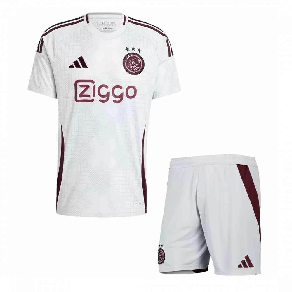 Step onto the pitch with the Ajax Third Away Jerseys Kit, where tradition meets modern design. Featuring a crisp white base adorned with subtle geometric patterns and deep maroon accents, this kit honors Ajax’s legacy of elegance and precision. The three stars above the crest proudly represent the club’s storied success, while the sleek detailing brings a fresh, contemporary edge to a timeless look.