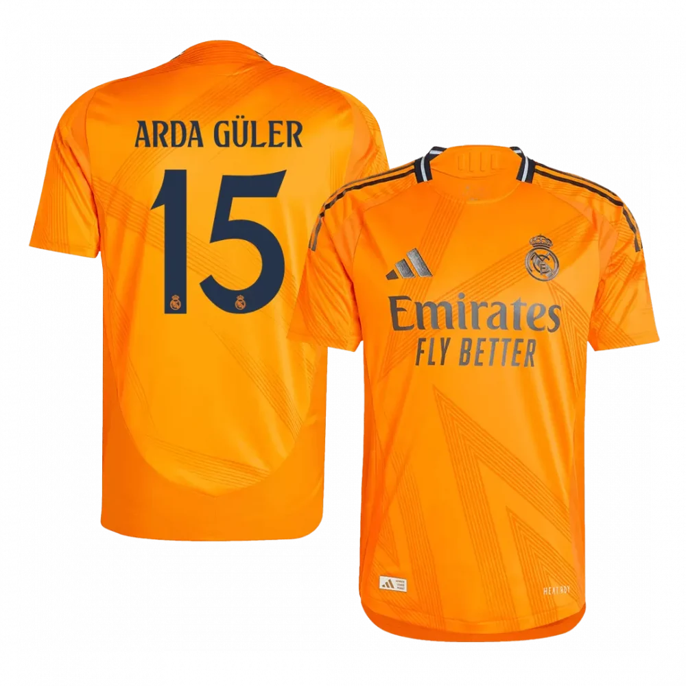 Step onto the pitch with bold confidence wearing the ARDA GÜLER #15 Real Madrid Away Authentic Soccer Jersey. This striking orange kit features dynamic geometric patterns and sleek dark accents that pay homage to the club’s adventurous spirit beyond the home stadium. Crafted to deliver peak performance, its lightweight, breathable fabric keeps you cool and comfortable while honoring the legacy of one of football’s most legendary teams.