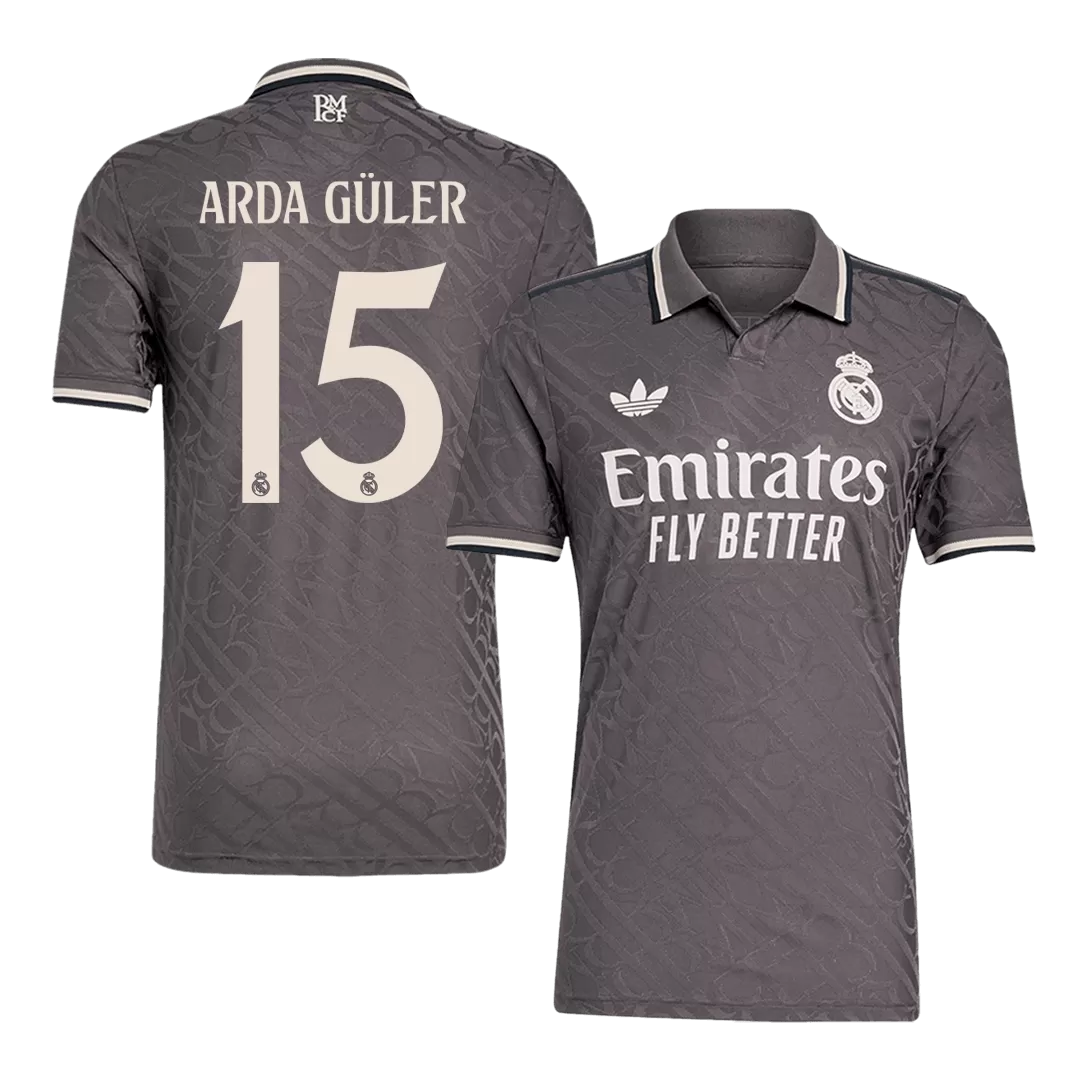 Step into the legacy of one of football’s most storied clubs with the ARDA GÜLER #15 Real Madrid Third Away Authentic Soccer Jersey. Featuring a sleek dark grey base with subtle geometric patterns and contrasting light beige accents on the collar, sleeve cuffs, and lettering, this jersey balances modern style with timeless elegance. Honoring Real Madrid’s tradition of excellence, it’s designed for fans who appreciate both heritage and on-field performance.