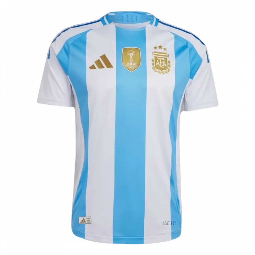 Step onto the pitch wearing the Argentina Home Authentic Soccer Jersey, a true symbol of passion and pride. Featuring the iconic sky blue and white stripes that have defined Argentine football for over a century, this jersey honors the rich legacy of a nation known for its flair, skill, and history of world champions. Gold accents celebrate recent triumphs, while the lightweight, breathable fabric keeps you cool and comfortable in every match.