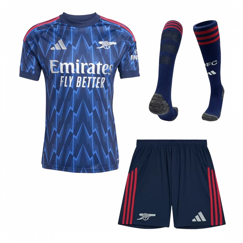 Step into the action with the Arsenal Away Jerseys Full Kit 2025/26, showcasing a striking navy blue base adorned with dynamic lightning bolt patterns in vibrant shades of blue. Accented by bold red stripes along the shoulders and shorts, this kit pays homage to Arsenal’s fearless spirit and electrifying style of play, echoing the club’s tradition of bold innovation and resilience.