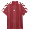 • Features striking red front and back panels with contrasting white sleeves and blue striping details