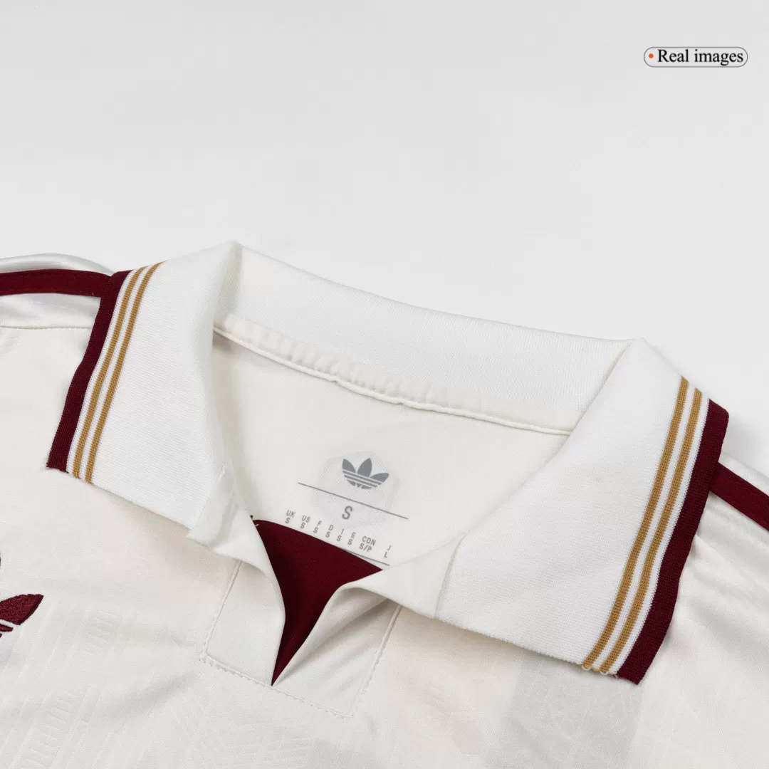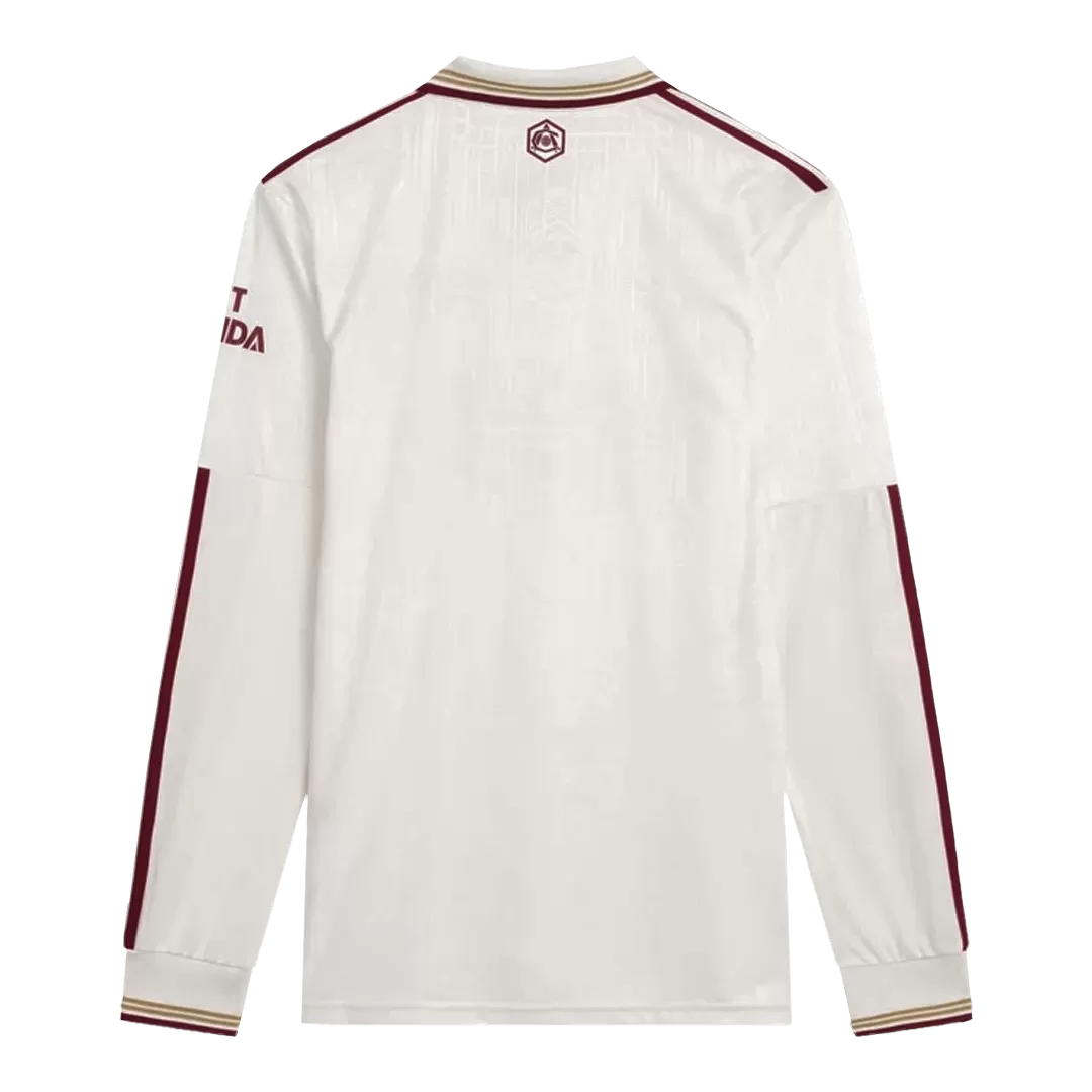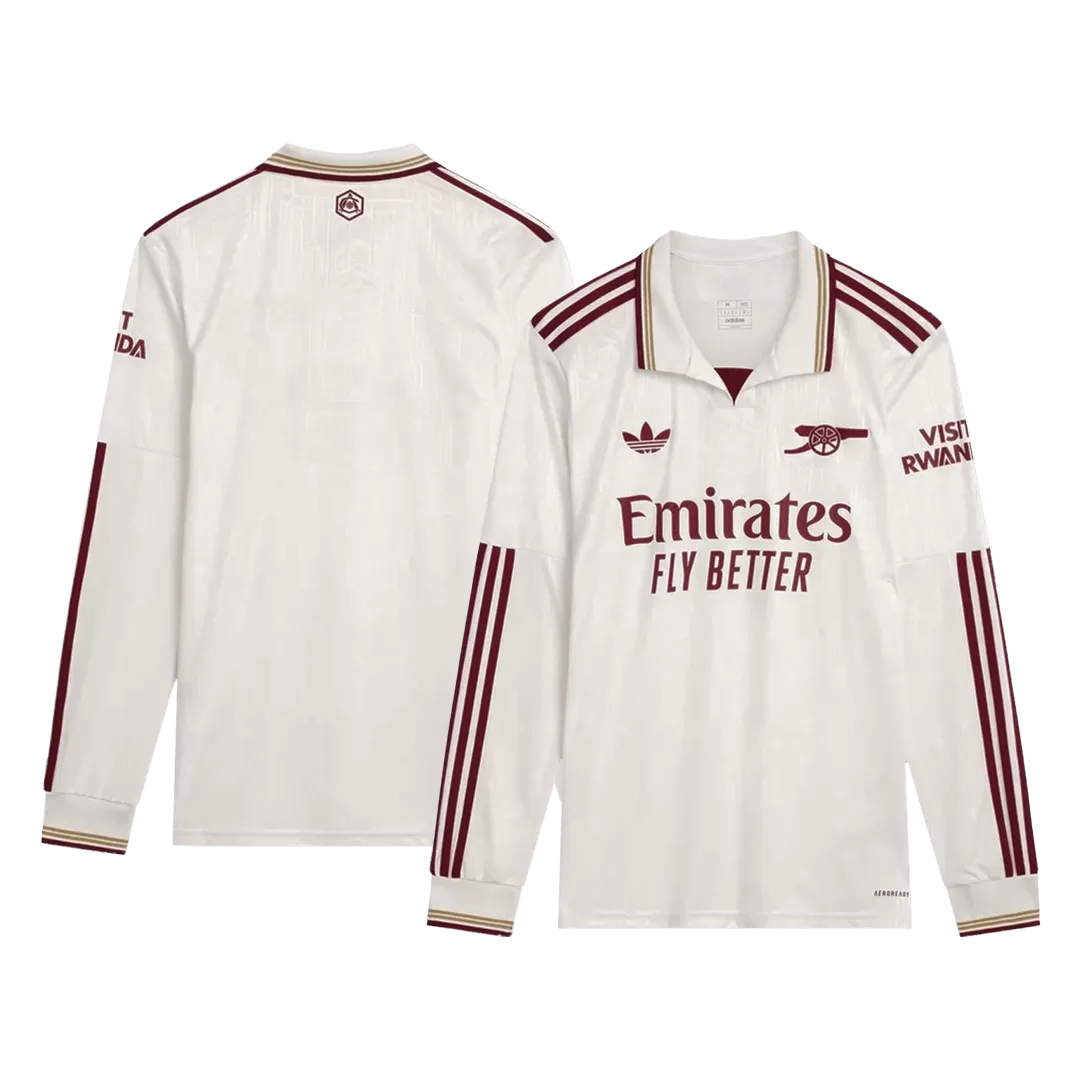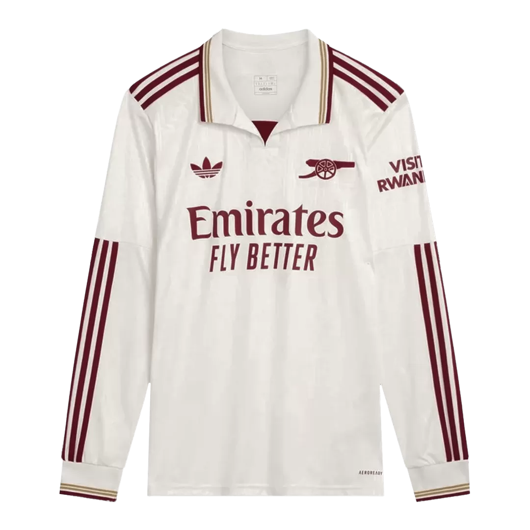 Step into history with the Arsenal Third Away Long Sleeve Jersey 2025/26, where classic elegance meets modern performance. The clean white base is accented by deep maroon stripes and trim, paying homage to Arsenal’s rich heritage while offering a fresh, sophisticated look on the pitch. This long-sleeve jersey brings timeless style combined with advanced moisture-wicking and breathable fabric to keep you comfortable from kickoff to the final whistle.