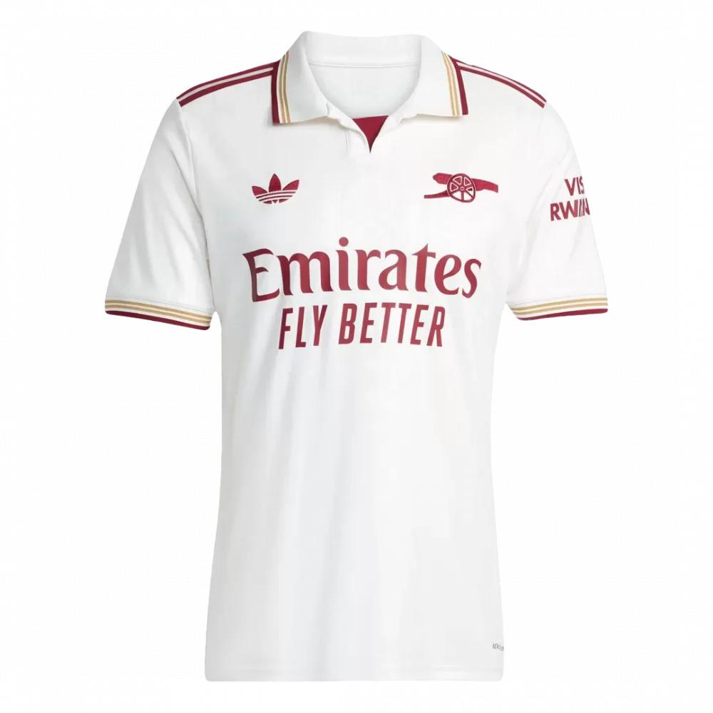 Step onto the pitch with the Arsenal Third Away Soccer Jersey 2025/26, a sleek tribute to the club’s rich heritage. Featuring a clean white base accented with deep red and subtle gold trims, this jersey embodies classic elegance and the legendary spirit of the Gunners. The retro-inspired collar and iconic cannon crest remind fans of Arsenal’s proud history, while the modern fit ensures peak athletic performance.