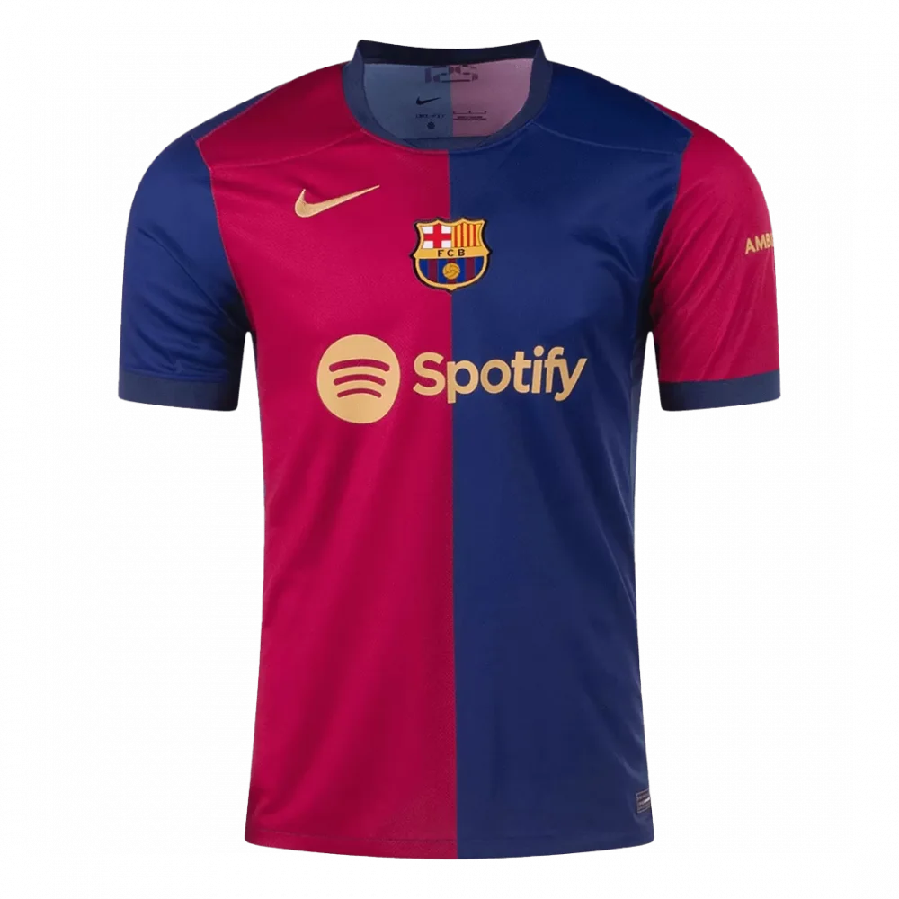Step into the legacy of one of football’s most iconic clubs with the Barcelona Home Soccer Jersey. Featuring the classic half-and-half design in deep blue and vibrant red, this jersey pays homage to the proud Catalan colors that have defined a century of passion, skill, and victory. Subtle gold accents highlight the crest and sponsor, adding a touch of modern elegance to this emblematic look.