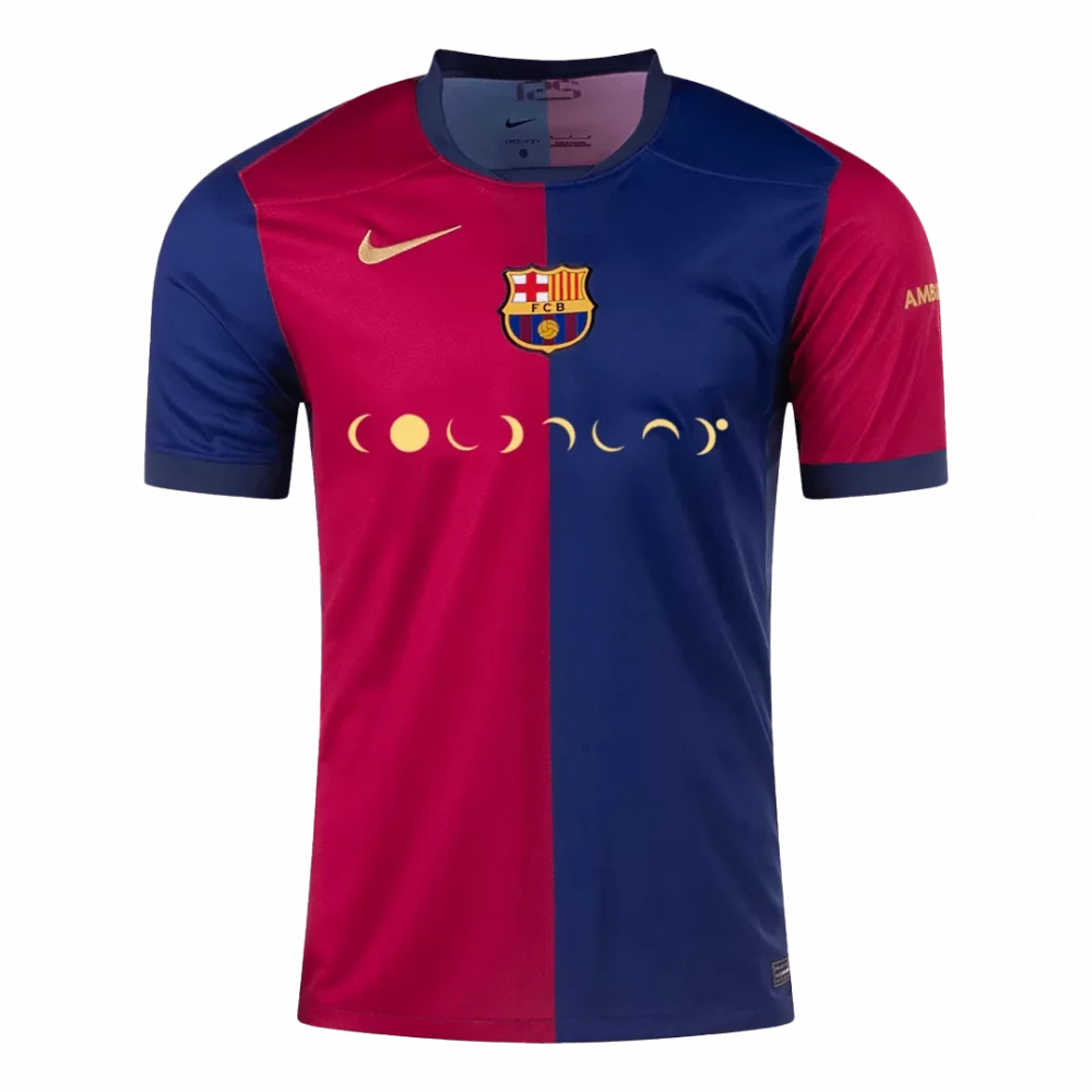 The Barcelona Home Soccer Jersey – COLDPLAY blends tradition with a modern twist, showcasing the iconic blue and garnet halves that symbolize the club’s rich history and passion. Featuring a unique gold phase-of-the-moon motif across the chest, this jersey celebrates creativity and rhythm—hallmarks of both the team and the legendary band. Crafted for optimal performance, it combines breathable, lightweight fabric with advanced moisture-wicking properties to keep you cool from kickoff to final whistle.