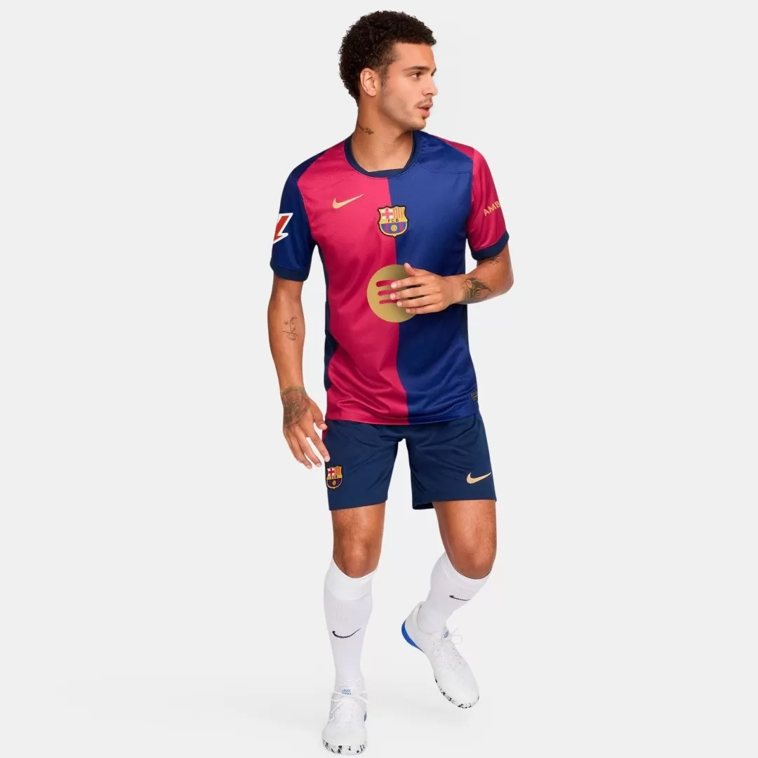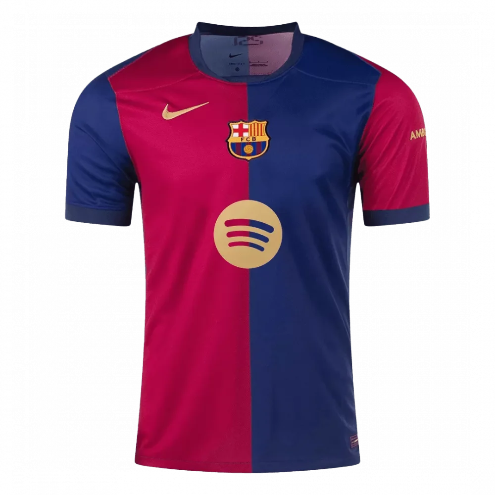 Step onto the pitch with the Barcelona Home Soccer Jersey, a bold statement of the club’s proud heritage. Featuring the iconic split design in deep red and blue, this jersey captures the spirit of Barcelona’s rich history and unwavering passion. The gold details, including the crest and sponsor logo, add a touch of elegance to this timeless classic.