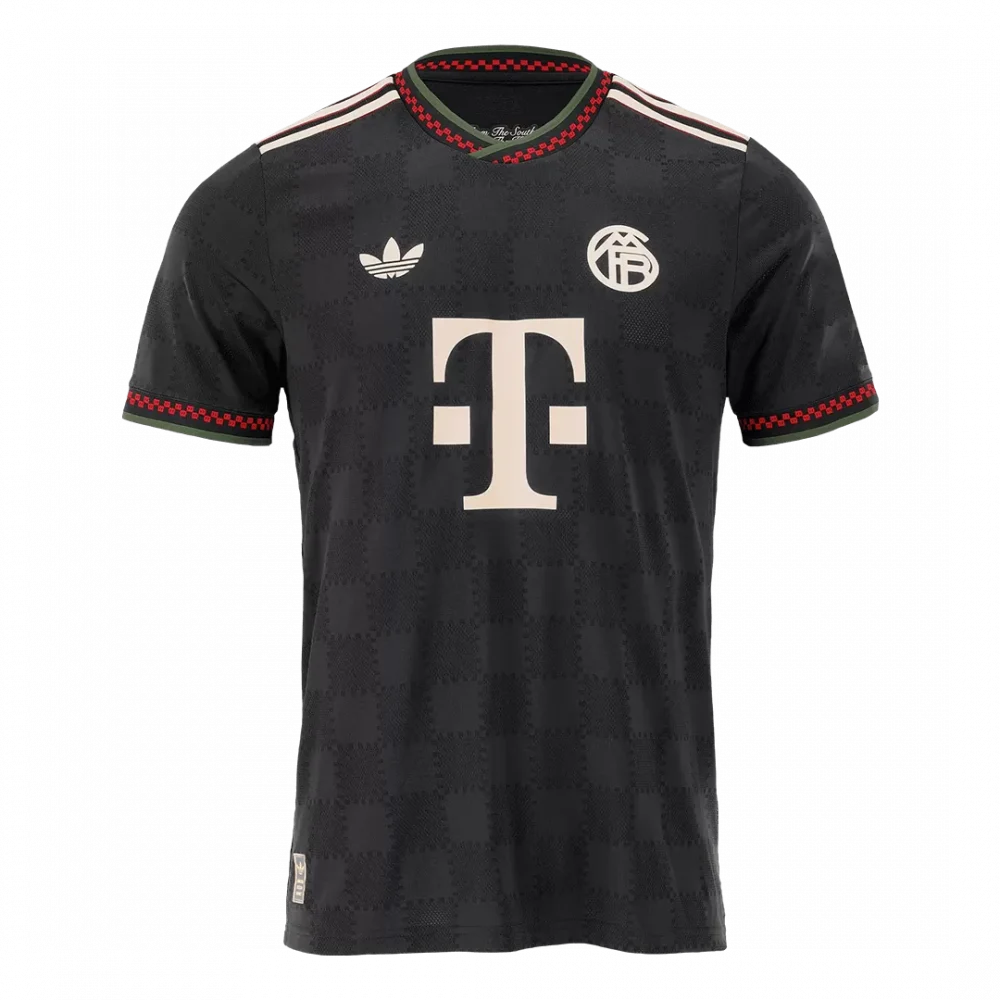 Step into the future of football with the Bayern Munich Third Away Authentic Soccer Jersey 2025/26. Featuring a sleek black base adorned with subtle checkerboard patterns, this jersey nods to tradition while embracing a modern edge. The striking red and green detailing around the collar and sleeves pays homage to the club’s rich heritage, capturing the fierce spirit of Bayern Munich’s relentless pursuit of excellence.