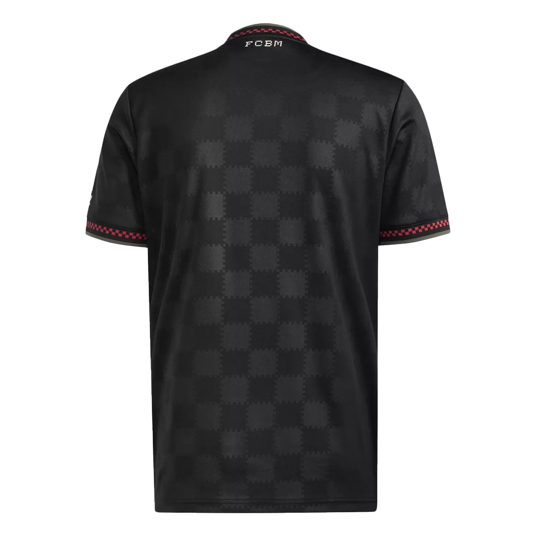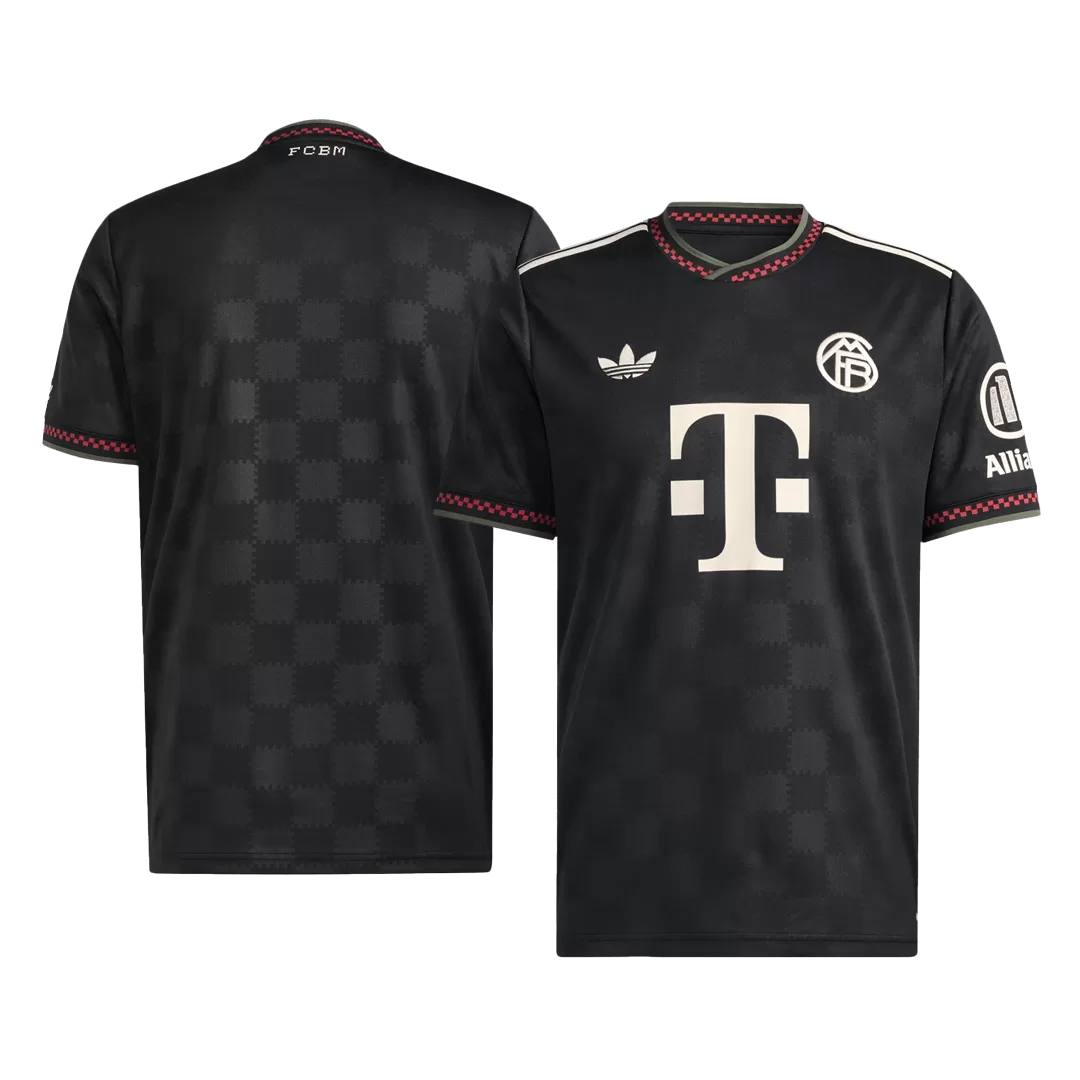 Step out boldly in the Bayern Munich Third Away Soccer Jersey 2025/26, a sleek tribute to the club’s rich heritage with a modern twist. Featuring a striking black base adorned with subtle checkered patterns and sharp red accents on the collar and cuffs, this jersey captures the fearless spirit of the Bavarian giants. The creamy white logos and sponsor details provide a powerful contrast, making this kit as iconic as Bayern’s relentless pursuit of glory.