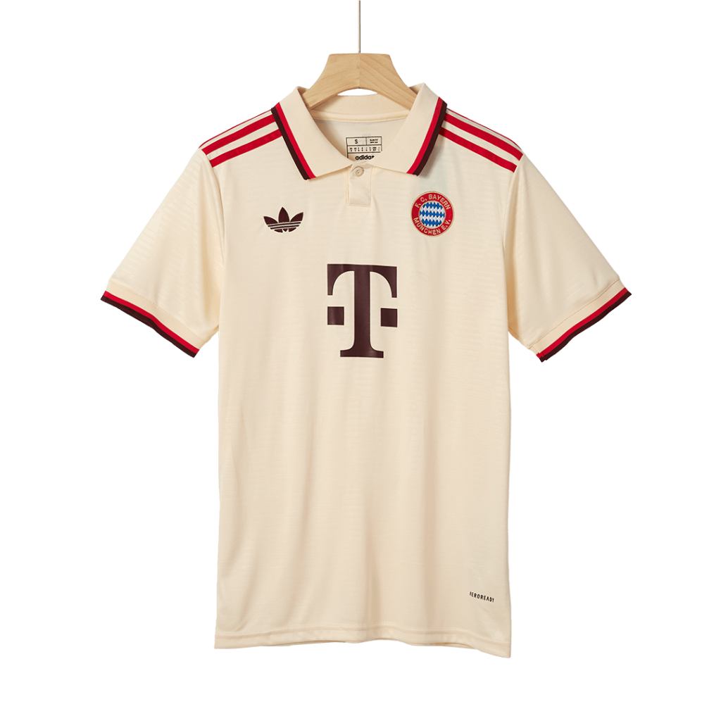Step onto the pitch with timeless style and modern performance in the Bayern Munich Third Away Soccer Jersey. Featuring a classic cream base accented by deep red details on the collar, sleeves, and iconic three stripes, this jersey pays homage to the club’s rich heritage while standing out in every competition, including the UCL. The understated elegance combines smoothly with functional design to keep you comfortable and focused from kickoff to final whistle.