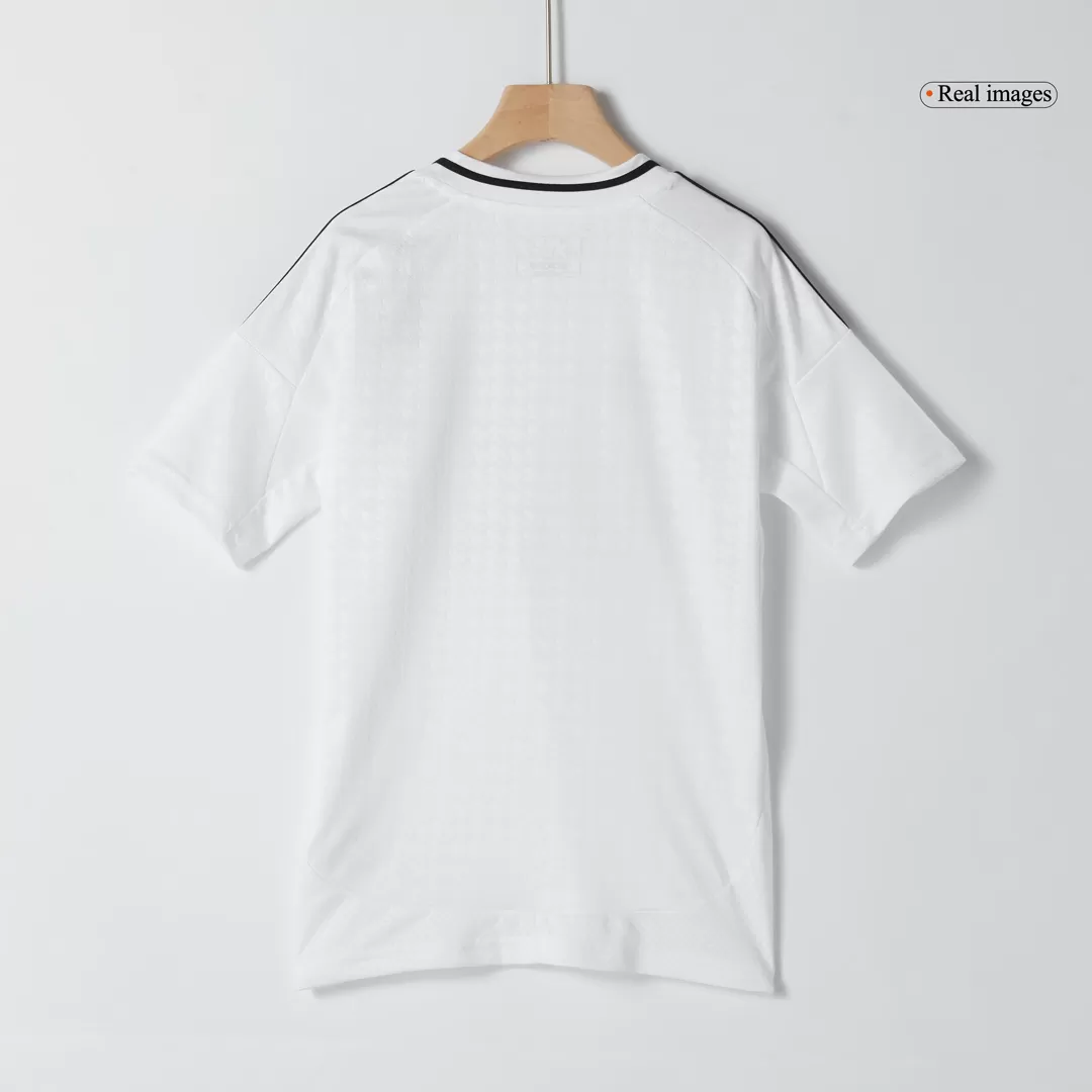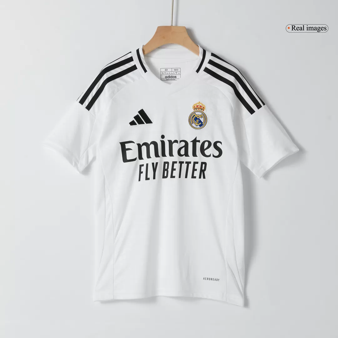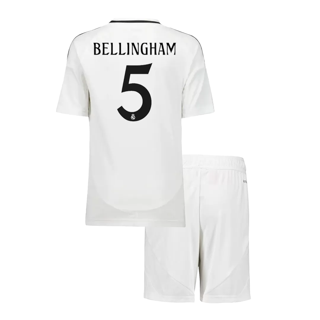 Step onto the pitch with the BELLINGHAM #5 Real Madrid Home Kids Soccer Jerseys Kit, showcasing a timeless all-white design accented by sleek black detailing on the collar and player name. This kit embodies the rich tradition of Real Madrid, a club renowned for its elegance, pride, and relentless pursuit of victory. Crafted to keep young athletes comfortable and focused, it features breathable, lightweight fabric with advanced moisture-wicking properties.