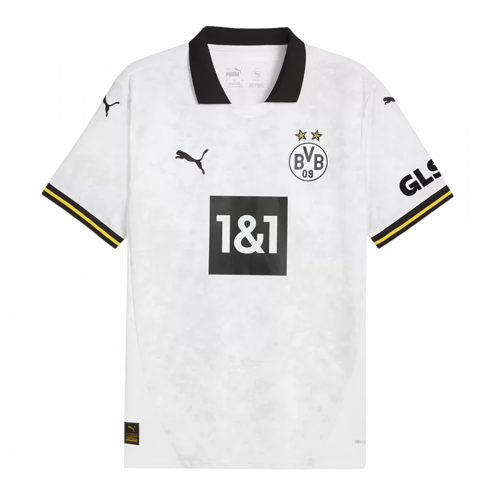 Step onto the pitch with the Borussia Dortmund Third Away Soccer Jersey, a sleek tribute to the club’s winning spirit. Featuring a crisp white base with subtle marbled patterns, this jersey is accented by sharp black details on the collar and sleeve cuffs, highlighted with the team’s signature yellow stripes. It captures the relentless energy and bold identity of BVB, honoring a legacy built on passion and precision.