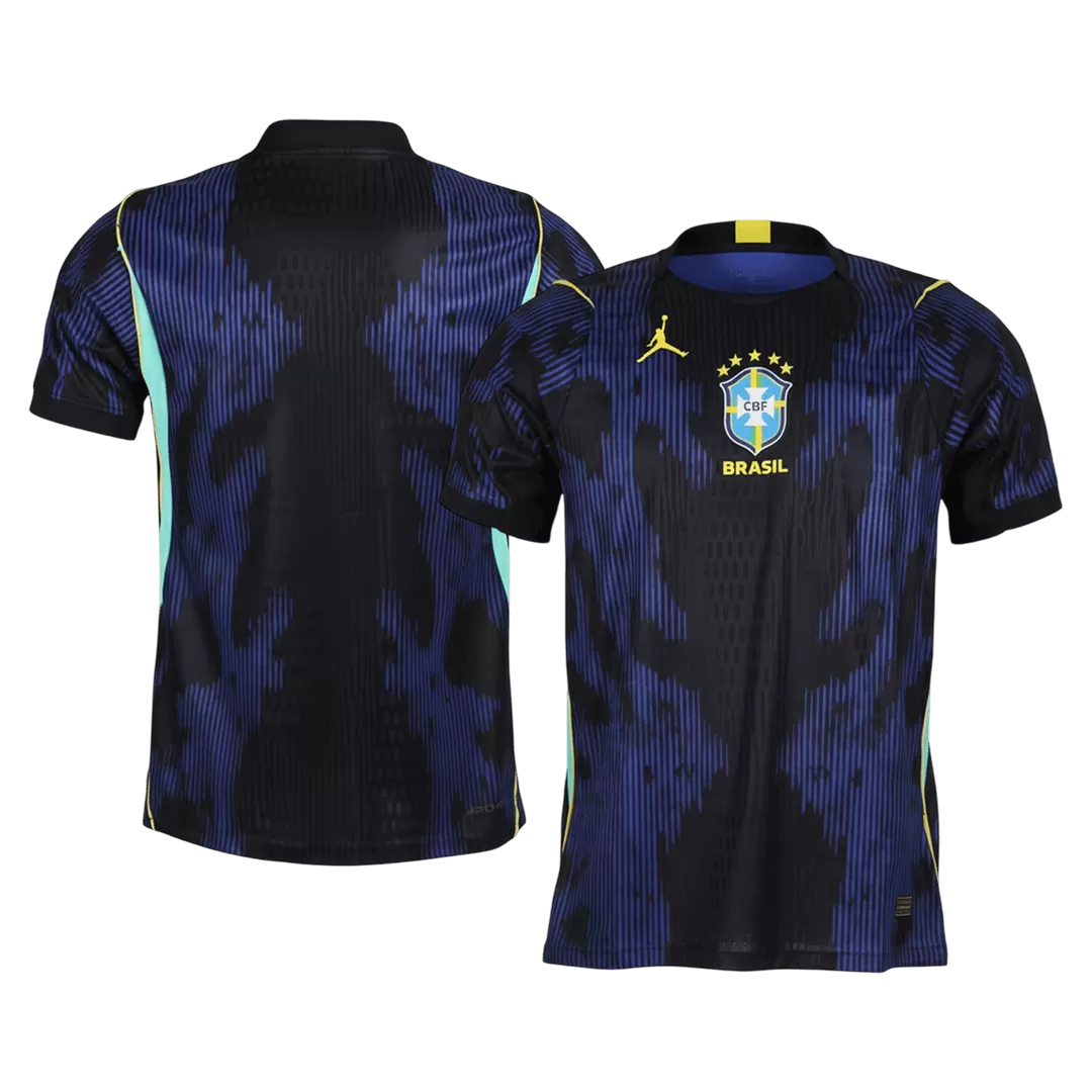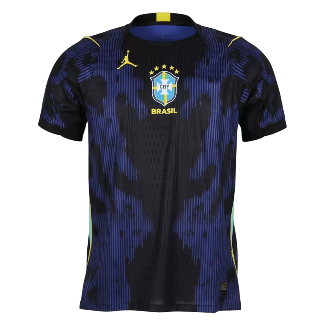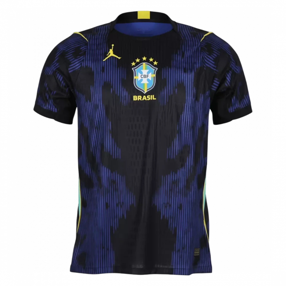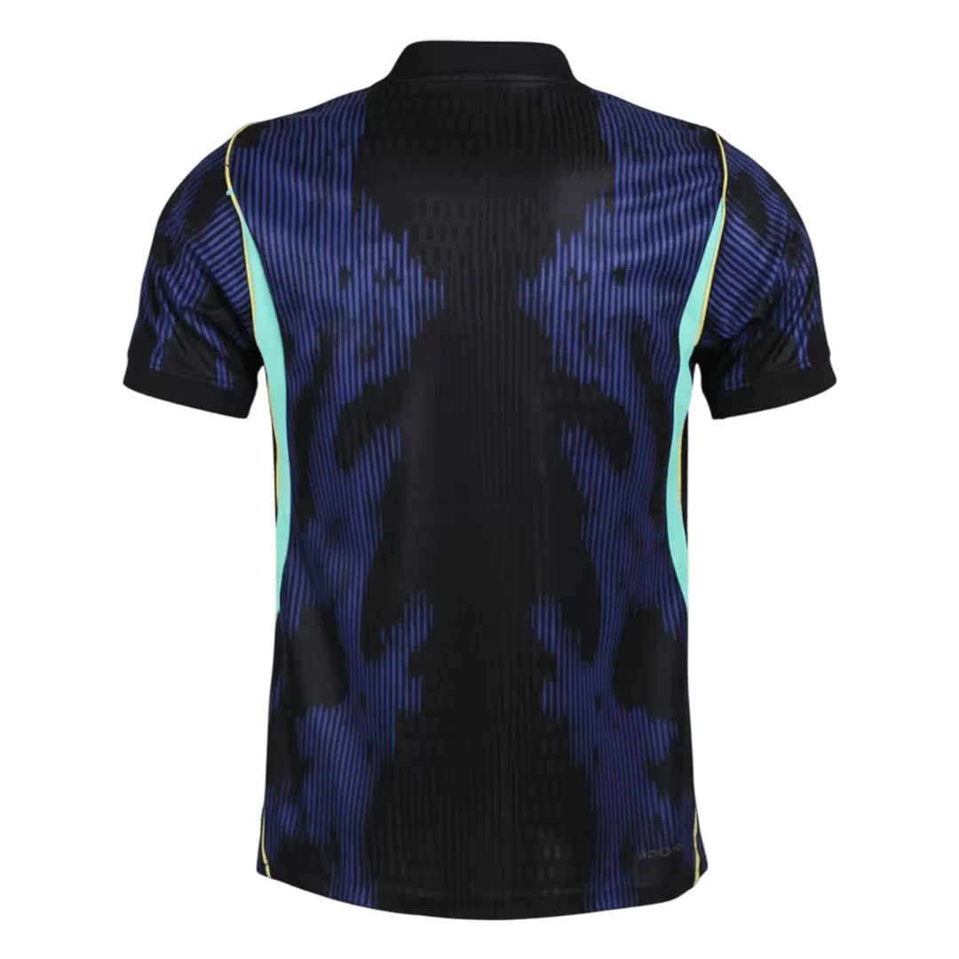 Step into the future of football with the Brazil Away Player Version Jersey for World Cup 2026. Featuring a striking black base overlaid with dynamic blue patterns and bold yellow accents, this jersey captures the vibrancy and passion that define the Brazilian squad. The design echoes Brazil’s rich football legacy and relentless spirit on the global stage, making it a true statement piece for fans and players alike.