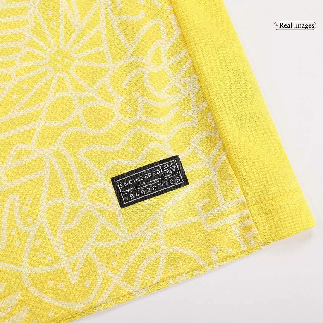 Bring the spirit of Brazil’s legendary football to the pitch with the Brazil Home Kids Soccer Jerseys Kit Copa America. Featuring a vibrant yellow jersey with an intricate, abstract pattern inspired by Brazilian culture and natural motifs, this kit honors the country’s storied history and passion for the game. Contrasting green trim and iconic blue shorts complete the look, making young fans feel like part of the Seleção as they play.