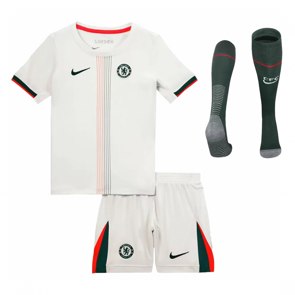 Step onto the pitch with the Chelsea Away Kids Soccer Jerseys Full Kit 2025/26, featuring a fresh white base accented by bold green and red details that pay tribute to the club’s rich heritage. The slim vertical stripes on the jersey echo Chelsea’s dynamic spirit, while the matching shorts and dark green socks complete a look that young fans will be proud to wear. Crafted from lightweight, breathable fabric with advanced moisture-wicking properties, this kit keeps young players comfortable and focused during every match.
