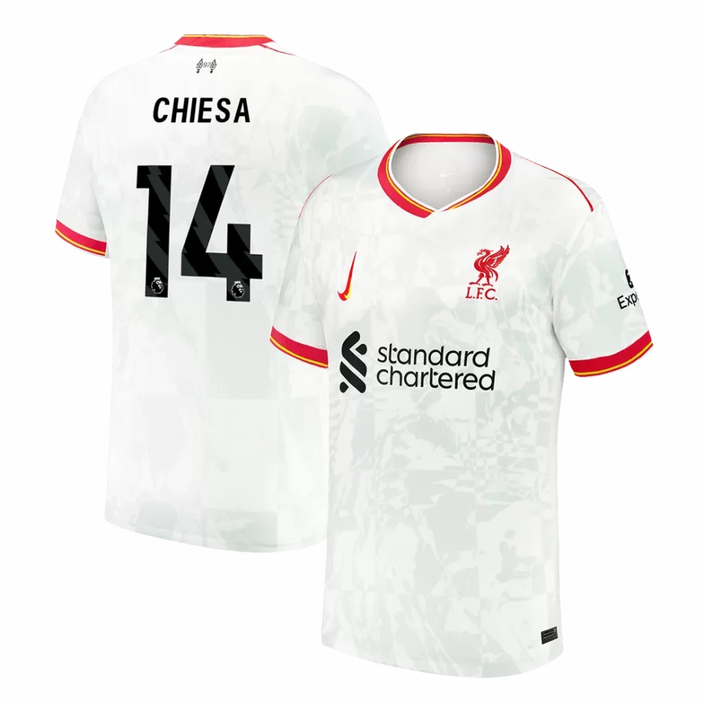 Step out with the CHIESA #14 Liverpool Third Away Soccer Jersey, where clean white meets bold red and gold accents to create a striking look. This design pays homage to Liverpool’s rich legacy, capturing the spirit of relentless pursuit and passion that defines the Reds, while subtle patterns add dynamic texture to the fabric. Engineered to keep you comfortable from start to finish, this jersey features breathable, moisture-wicking materials ideal for high performance on the pitch.