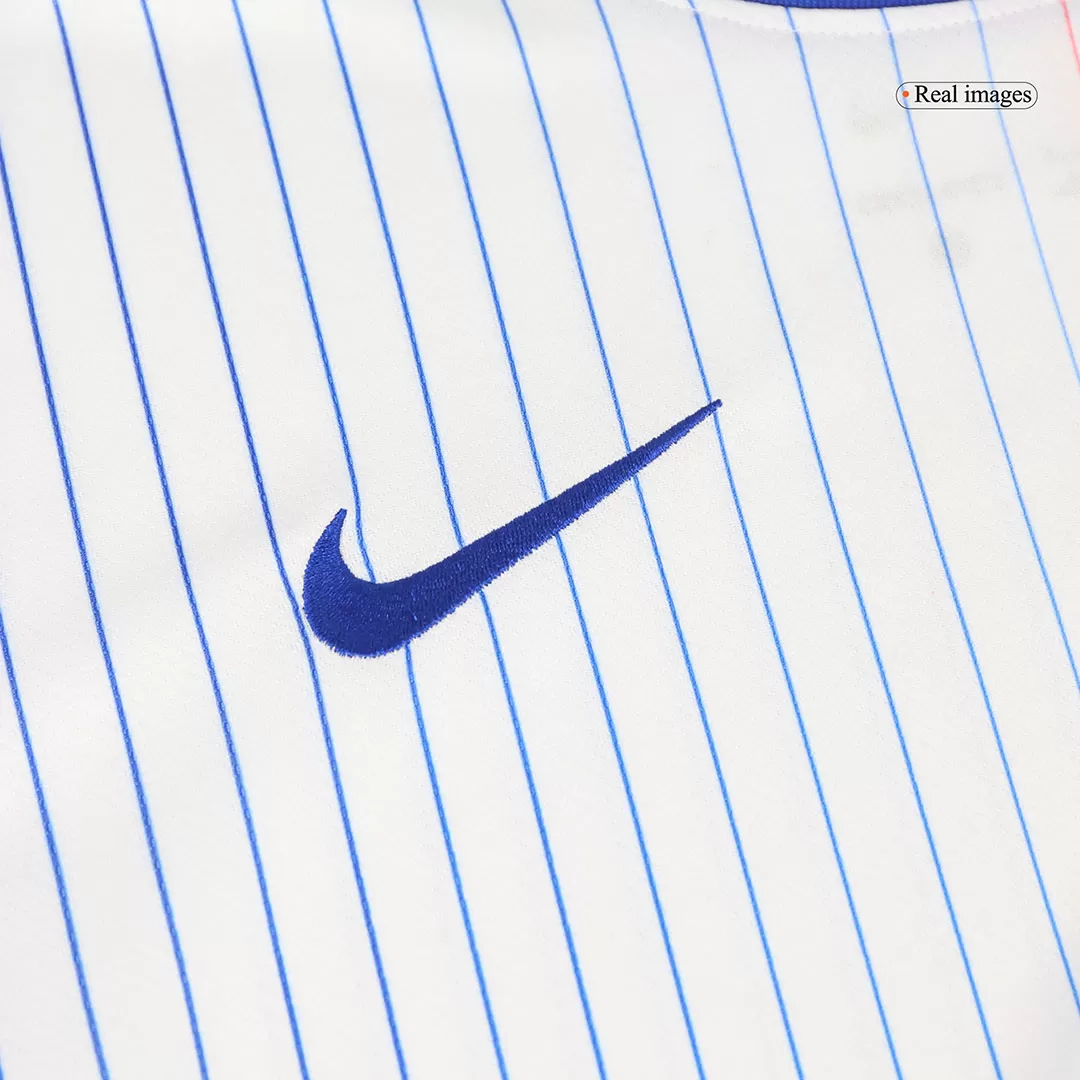 Step out in classic French flair with the DOUE #24 France Away Soccer Jersey. Featuring a striking pinstripe design in red and blue on a crisp white base, this jersey pays homage to France’s rich football tradition and the iconic national colors. The bold blue collar and sleeve cuffs frame the vibrant rooster crest, symbolizing pride and passion on every play.