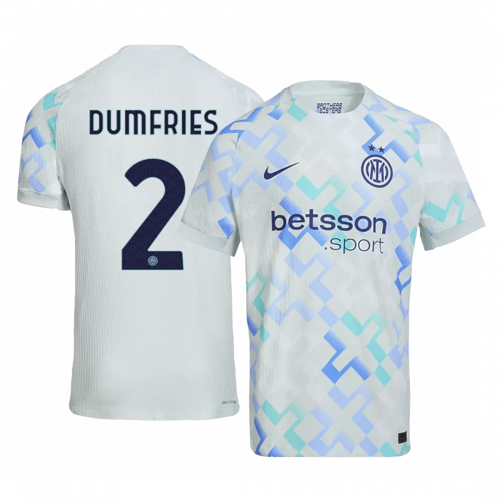 Step into the game with the DUMFRIES #2 Inter Milan Away Authentic Soccer Jersey 2025/26, a bold fusion of tradition and modernity. The striking white base is energized by dynamic geometric patterns in cool shades of blue and teal, echoing Inter Milan’s forward-thinking spirit and rich Milanese heritage. Designed for peak performance, this jersey offers a comfortable, lightweight fit crafted from breathable, moisture-wicking fabric to keep you cool and focused on the pitch.