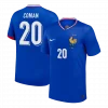 Celebrate the spirit of French football with this vibrant France Home Kids Soccer Jerseys Kit EURO. Featuring a bold blue jersey with a classic V-neck trimmed in red, white, and blue, it proudly carries the iconic Gallic rooster emblem and two stars symbolizing historic World Cup victories. Paired with crisp white shorts accented by matching tricolor details, this kit blends tradition and style perfectly for young fans.