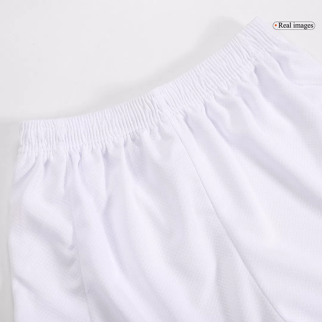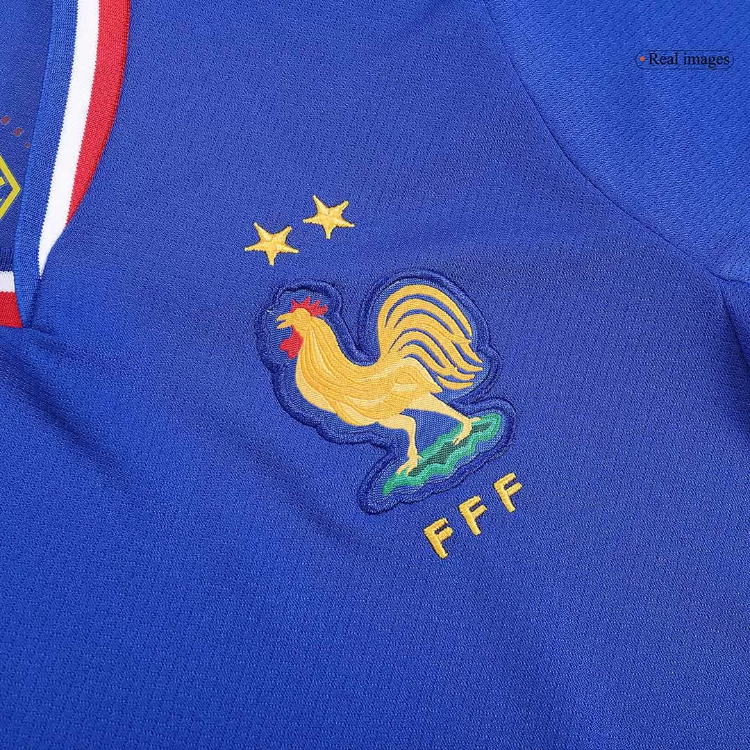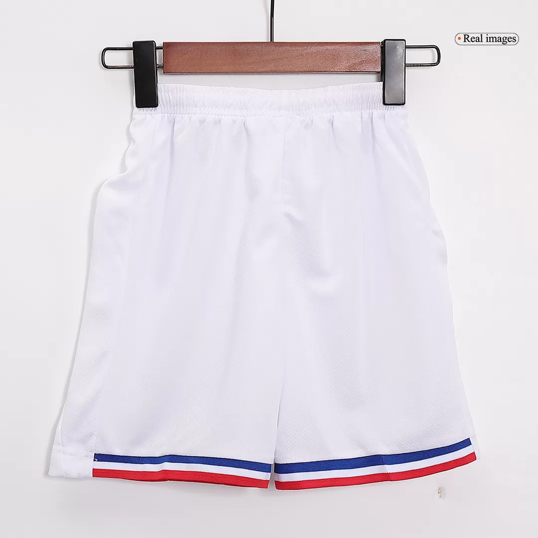 Celebrate the spirit of French football with this vibrant France Home Kids Soccer Jerseys Kit EURO. Featuring a bold blue jersey with a classic V-neck trimmed in red, white, and blue, it proudly carries the iconic Gallic rooster emblem and two stars symbolizing historic World Cup victories. Paired with crisp white shorts accented by matching tricolor details, this kit blends tradition and style perfectly for young fans.