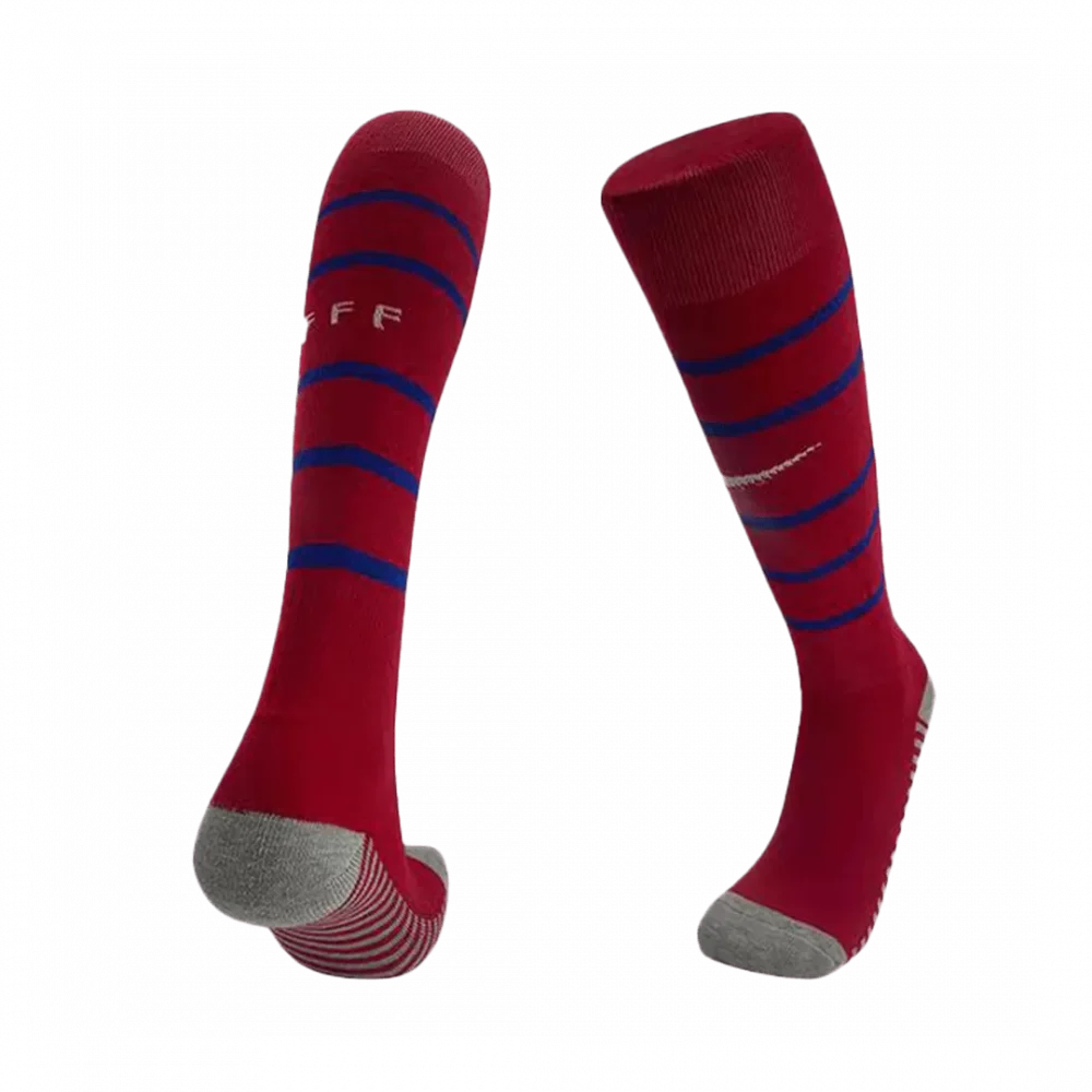 Step onto the pitch with the France Home Soccer Socks, designed to embody the spirit and pride of French football. Featuring a rich red base accented with bold royal blue stripes, these socks capture the dynamic energy and timeless style of Les Bleus. Engineered for peak performance, they offer a comfortable fit with breathable, moisture-wicking fabric to keep you cool and dry during every match.
