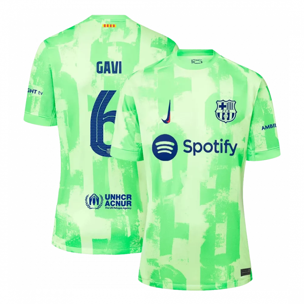Step into the future of FC Barcelona with the GAVI #6 Third Away Soccer Jersey, a vibrant celebration of the club’s bold spirit and innovation. Featuring a striking neon green palette with abstract brushstroke patterns, this jersey captures the energy and creativity synonymous with Barcelona’s attacking style and rich footballing history. Perfect for fans who live and breathe the game, it combines standout design with high-performance fabric that keeps you cool, dry, and light on your feet.