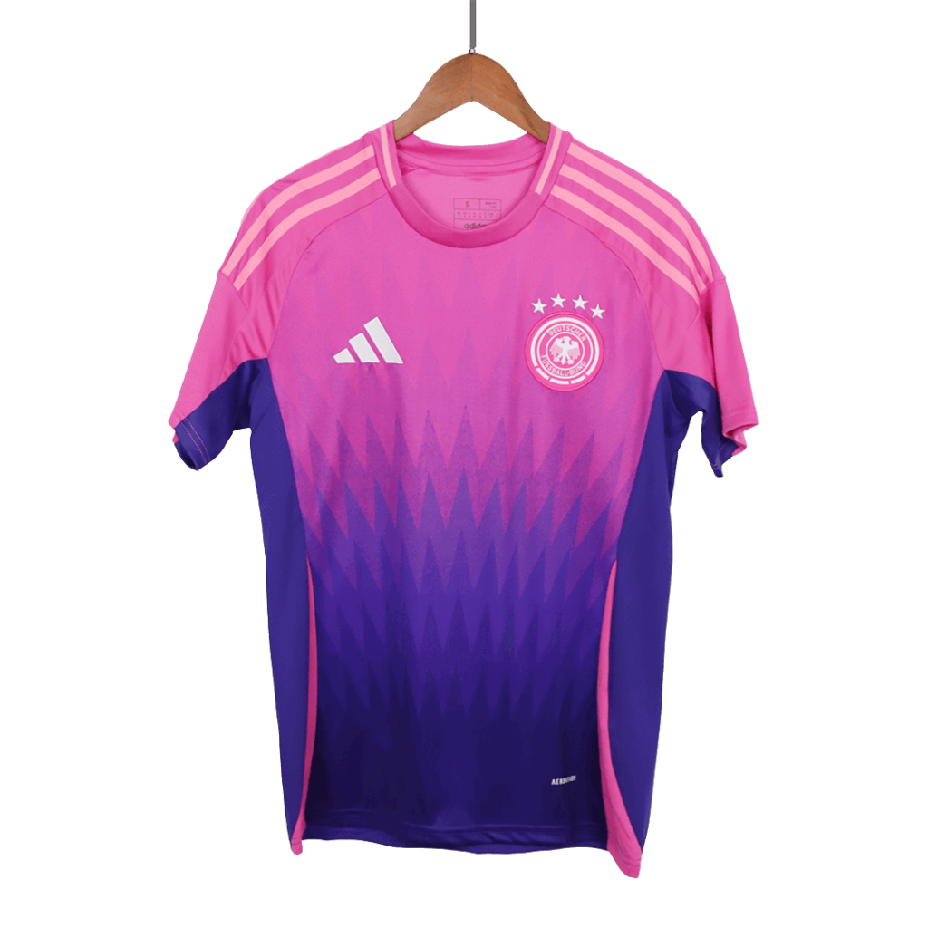 Step into the future of German football with the Germany Away Soccer Jersey EURO, where bold pink meets deep purple in a striking gradient that pays homage to the nation’s forward-thinking spirit. Featuring a sharp zigzag pattern inspired by traditional designs and crowned with four stars for World Cup triumphs, this jersey blends vibrant style with rich heritage. Crafted for peak performance, it keeps you cool and dry with breathable, moisture-wicking fabric while offering a lightweight, comfortable fit.