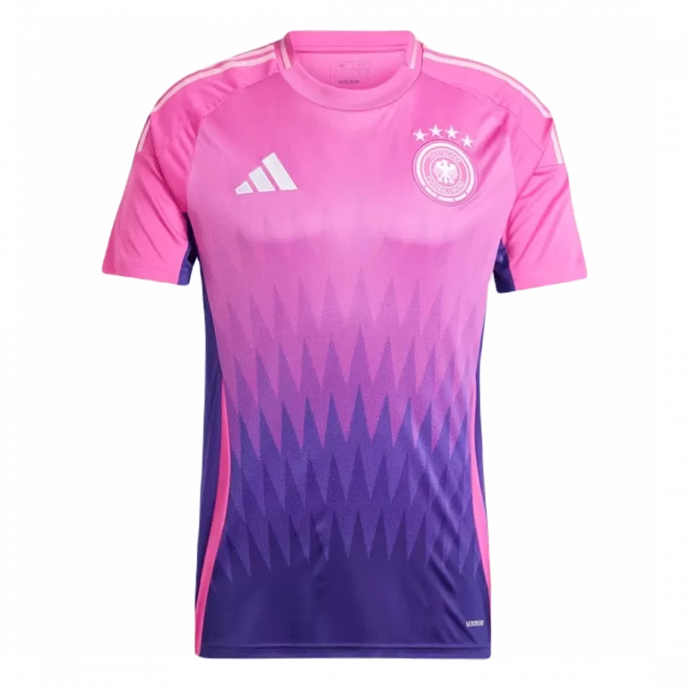 Step into the future of German football with the Germany Away Soccer Jersey EURO, where bold pink meets deep purple in a striking gradient that pays homage to the nation’s forward-thinking spirit. Featuring a sharp zigzag pattern inspired by traditional designs and crowned with four stars for World Cup triumphs, this jersey blends vibrant style with rich heritage. Crafted for peak performance, it keeps you cool and dry with breathable, moisture-wicking fabric while offering a lightweight, comfortable fit.