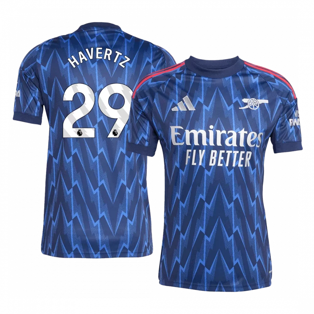 Step into the heart of the game with the 2025/26 Arsenal Away Soccer Jersey featuring Havertz #29. This striking jersey showcases a dynamic blue lightning-inspired pattern that energizes the classic Arsenal cannon crest, symbolizing the club’s relentless spirit and historic pursuit of excellence. Lightweight and breathable, it’s crafted with advanced moisture-wicking fabric to keep you cool and focused whether on the pitch or in the stands.