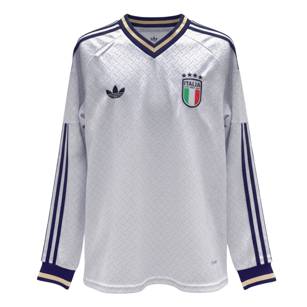 Step into Italy’s rich football heritage with the Italy Away Long Sleeve Jersey for World Cup 2026. This sleek white jersey features subtle geometric patterns and classic navy and gold trim on the collar and cuffs, reflecting the timeless elegance and pride of the Azzurri. Emblazoned with the iconic three-star crest, it honors Italy’s storied history of excellence on the world stage.