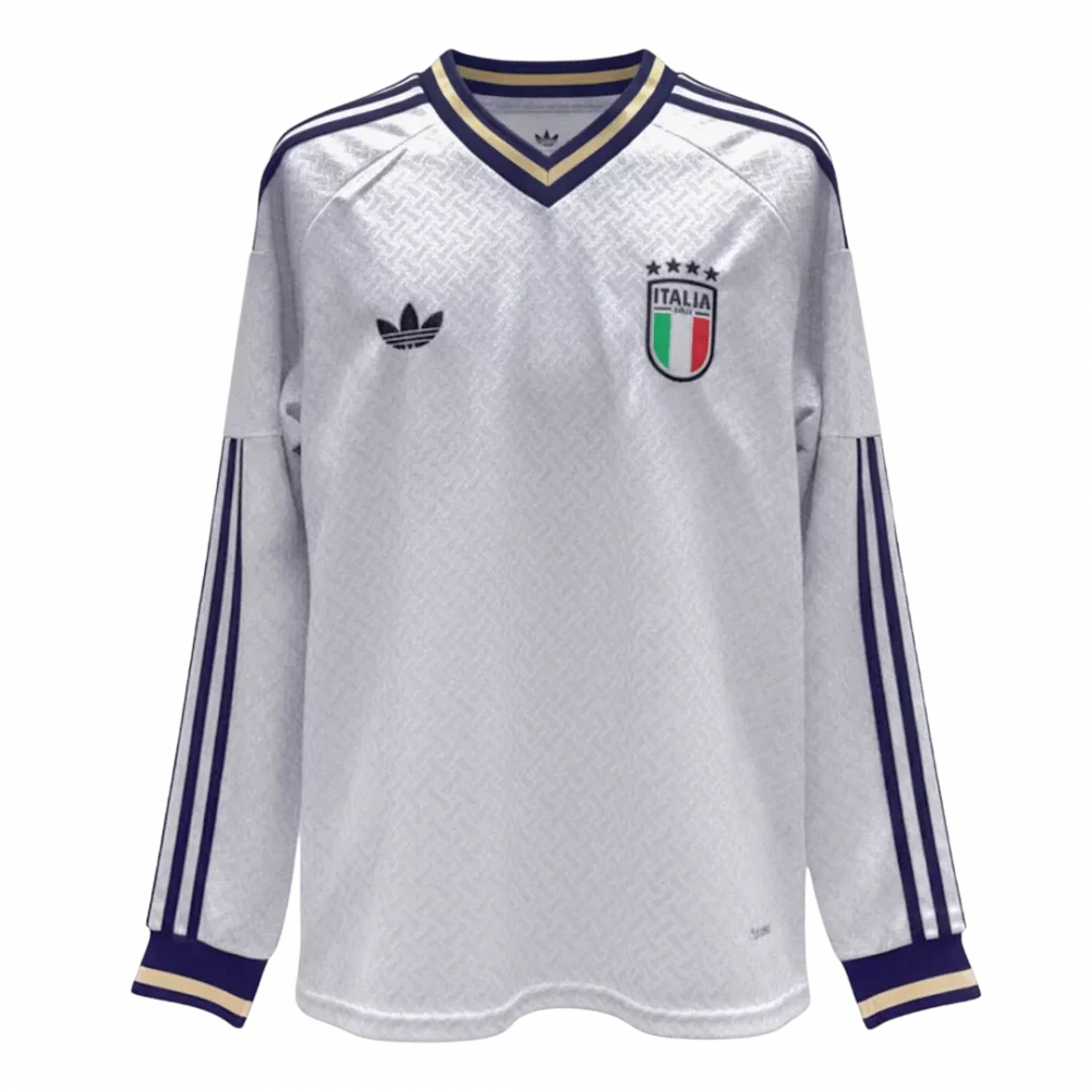 Step into Italy’s rich football heritage with the Italy Away Long Sleeve Jersey for World Cup 2026. This sleek white jersey features subtle geometric patterns and classic navy and gold trim on the collar and cuffs, reflecting the timeless elegance and pride of the Azzurri. Emblazoned with the iconic three-star crest, it honors Italy’s storied history of excellence on the world stage.