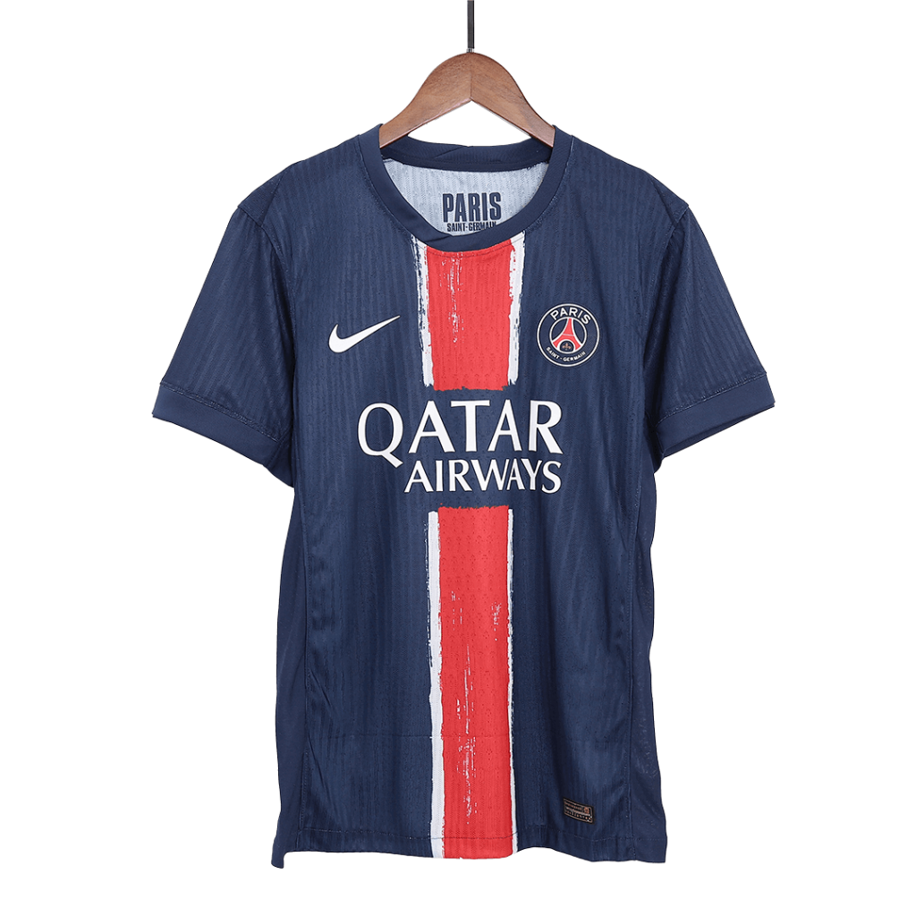 Step onto the pitch with the KVARATSKHELIA #7 PSG Home Authentic Soccer Jersey, a bold tribute to Paris Saint-Germain’s rich legacy. Featuring the classic deep navy base, the jersey highlights a striking vertical red and white brushstroke down the center, symbolizing the club’s passion and Parisian pride. Crisp details such as the subtle French flag at the back collar and the iconic PSG crest make this jersey a standout both on and off the field.