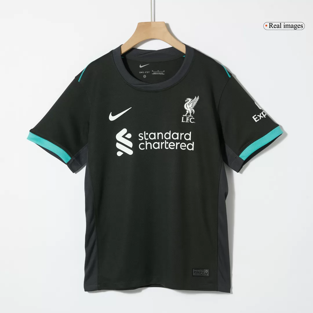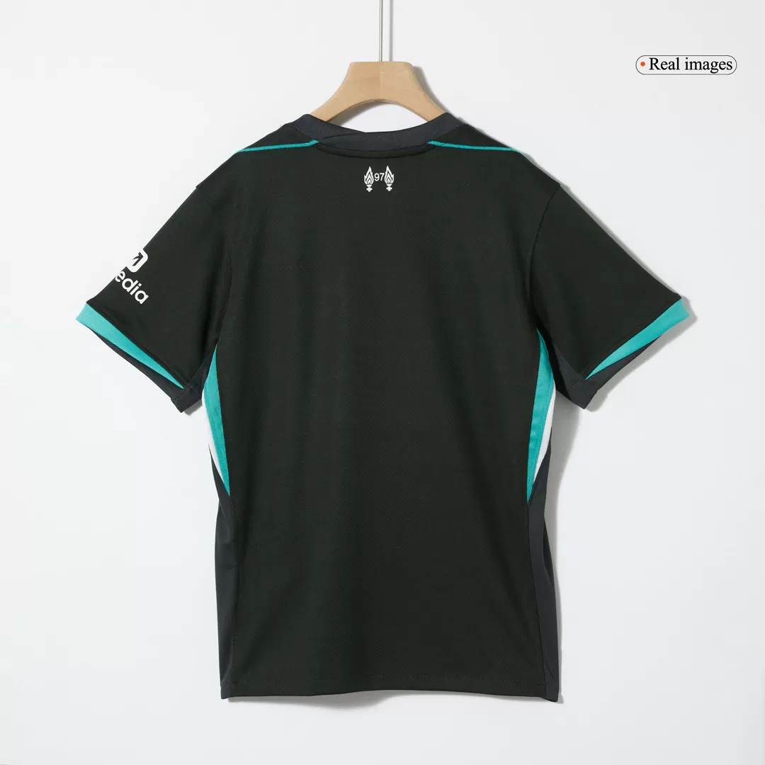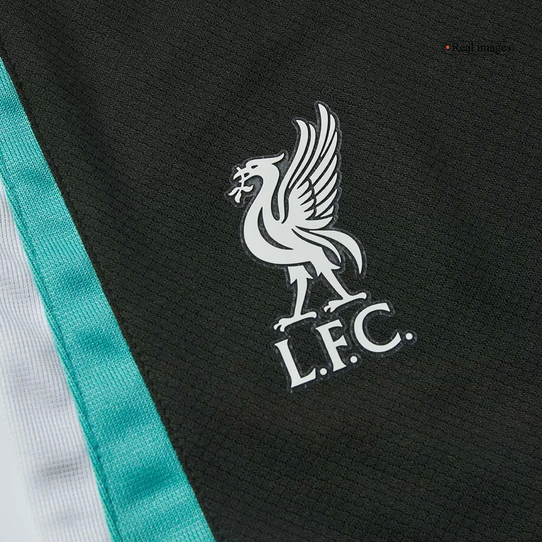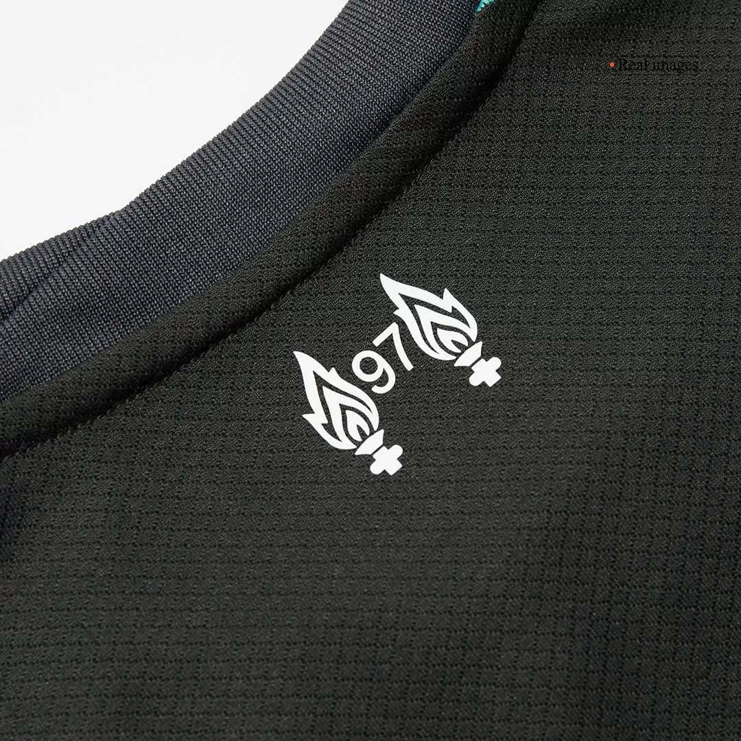 Step into the spirit of the Reds with the Liverpool Away Kids Soccer Jerseys Kit, featuring a sleek black base accented by vibrant teal highlights on the sleeves and shorts. This bold, modern design echoes Liverpool’s fearless approach and rich football heritage, perfect for young fans ready to embrace the club’s relentless energy. Crafted with breathable, lightweight fabric and advanced moisture-wicking to keep kids cool and comfortable on the pitch.