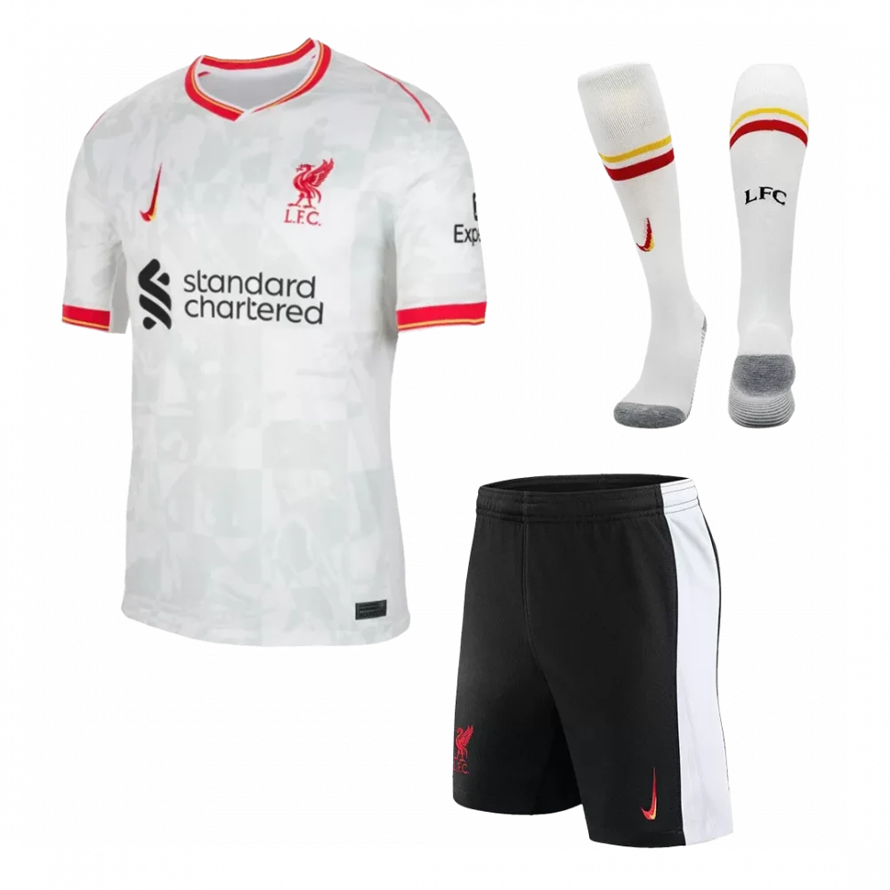 Step onto the pitch with the Liverpool Third Away Jerseys Full Kit, where classic white takes center stage, accented by bold red and yellow trim that echoes the club’s rich heritage and fiery spirit. The subtle patterned fabric adds depth and texture, celebrating the passion and unity that define Liverpool’s legacy. Designed for peak performance, this kit combines breathable, lightweight materials with advanced moisture-wicking properties to keep you cool and comfortable during every match.