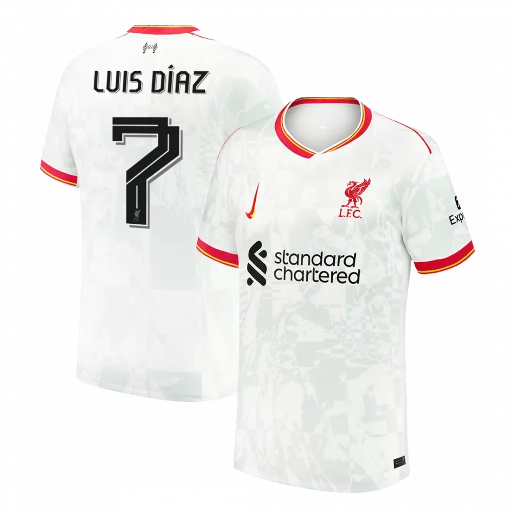 Step into the heart of Liverpool’s legacy with the Luis Díaz #7 Third Away Soccer Jersey. Featuring a crisp white base with subtle tonal patterns that evoke the club’s rich history, this jersey is accented by striking red and gold trim symbolizing Liverpool’s passion and pride. It’s a fresh, bold design for supporters who stand united behind the Reds.