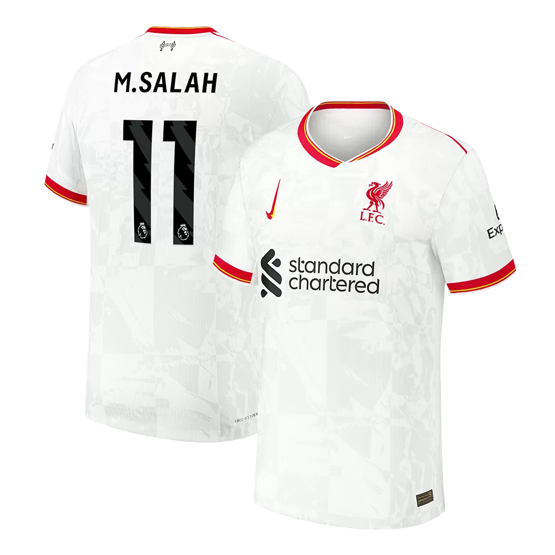 Step into the heart of Liverpool’s fighting spirit with the M. Salah #11 Third Away Authentic Soccer Jersey. Featuring a crisp white base accented by vibrant red and gold trim, this kit honors the club’s rich heritage while bringing a fresh, modern edge. The subtle patterned design adds depth and character, capturing the passion and pride of Anfield’s legends. Crafted for peak performance, this jersey offers breathable, moisture-wicking fabric that keeps you cool and comfortable during every match.