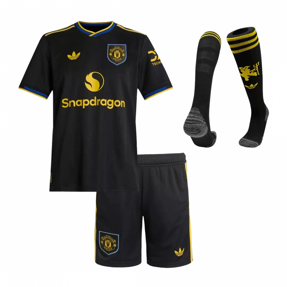 Step into the heart of tradition and bold style with the Manchester United Third Away Kids Soccer Jerseys Full Kit 2025/26. This striking black kit is accentuated with vibrant yellow and blue trim, reflecting the club’s enduring spirit and historic pride. The sleek design pays homage to Manchester United’s legacy while delivering comfort and agility for the young champions on the pitch.