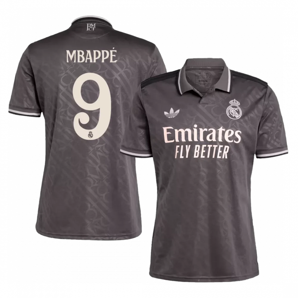 Step onto the pitch with confidence wearing the MBAPPÉ #9 Real Madrid Third Away Soccer Jersey. This striking charcoal gray kit features subtle tonal patterns that pay homage to the club’s rich heritage, while soft cream accents on the name, number, and detailing add a sophisticated contrast. Embracing both tradition and modern style, it reflects Real Madrid’s relentless spirit beyond the home stadium.