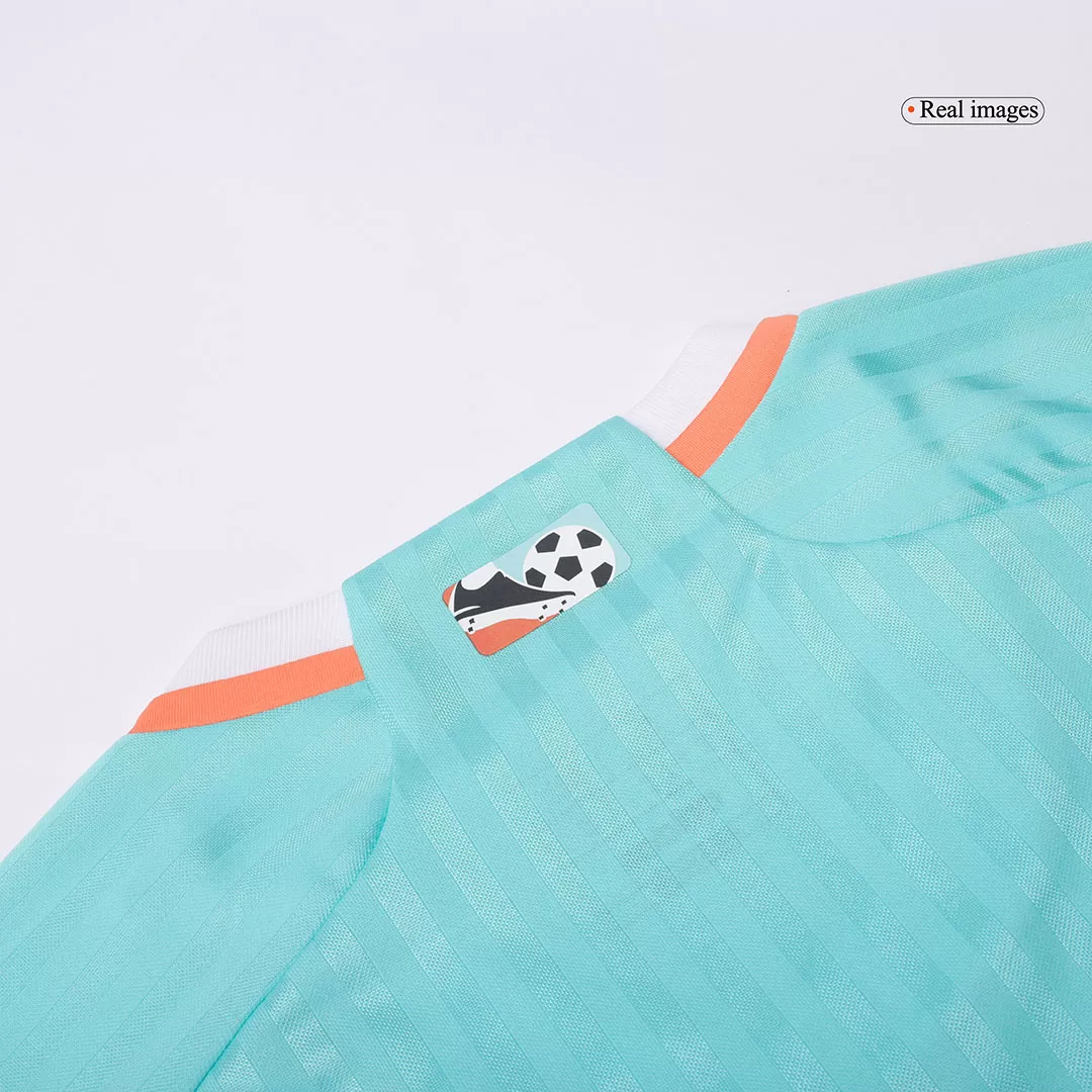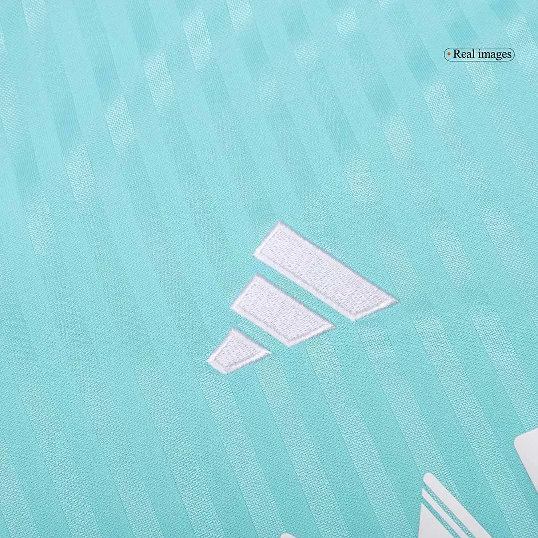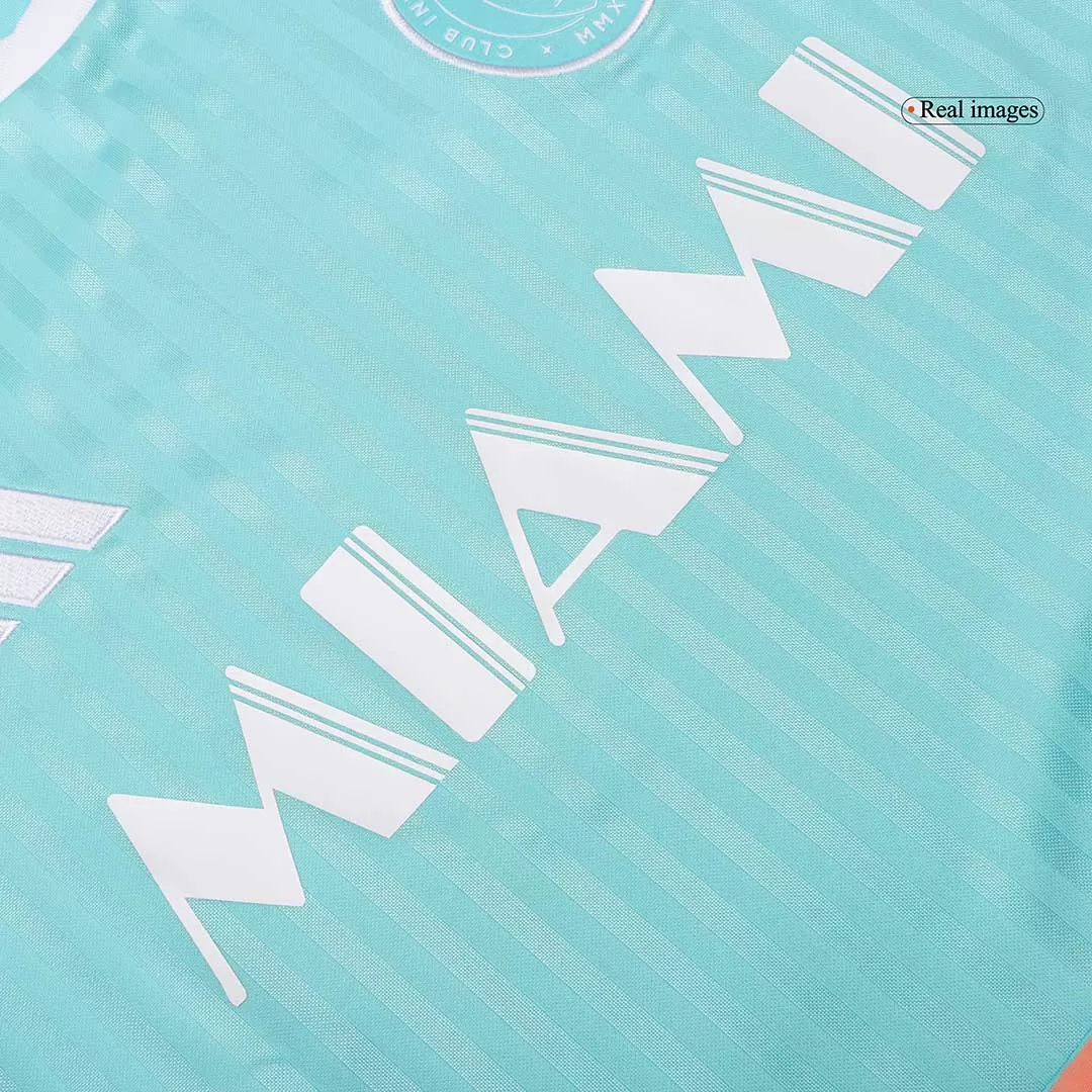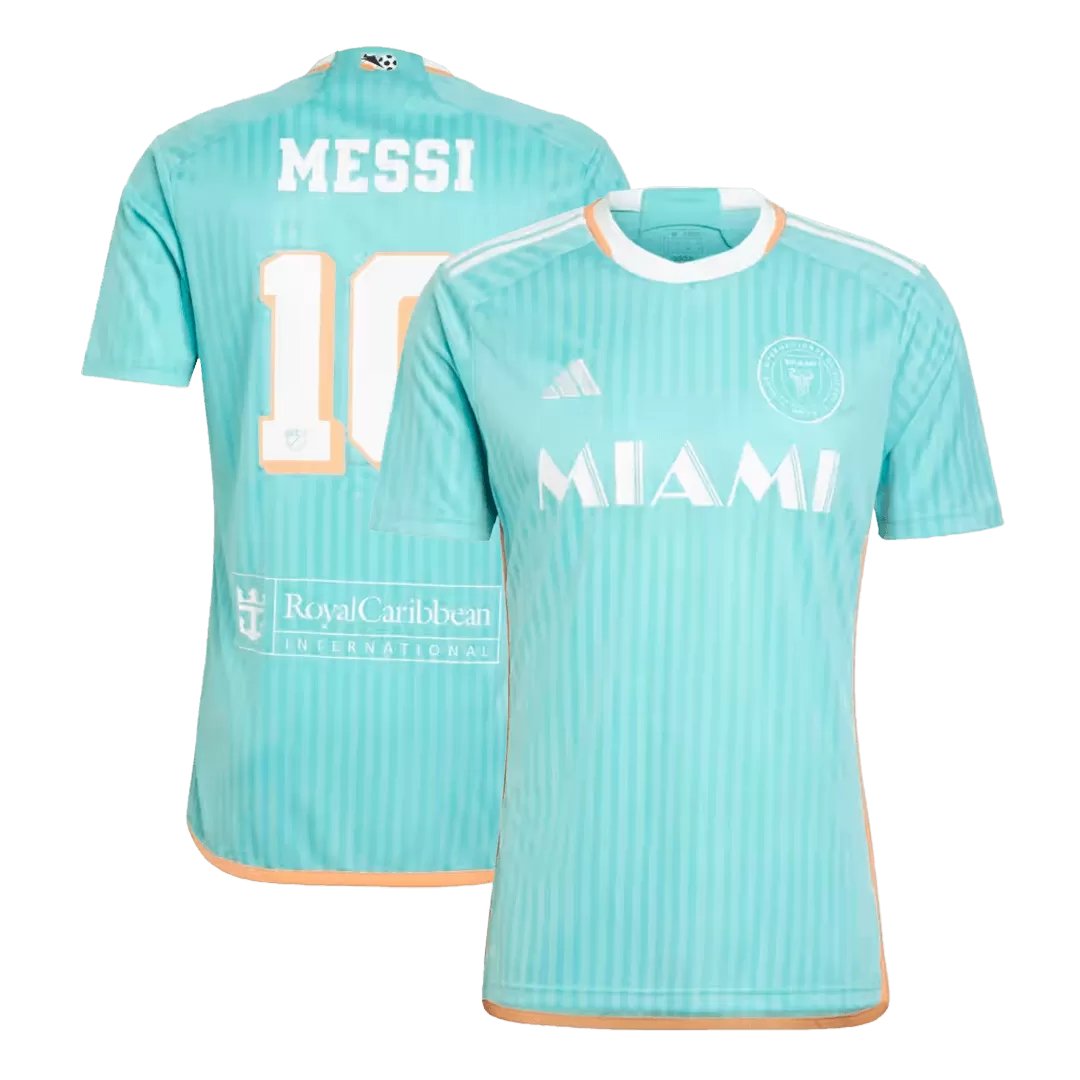 Step into the vibrant spirit of Inter Miami CF with the MESSI #10 Third Away Soccer Jersey. Featuring a refreshing aqua base accented by subtle vertical pinstripes and soft coral trim, this jersey reflects the club’s dynamic energy and coastal roots. Celebrate the legacy of Miami’s bold soccer culture while enjoying superior comfort and breathability on and off the pitch.