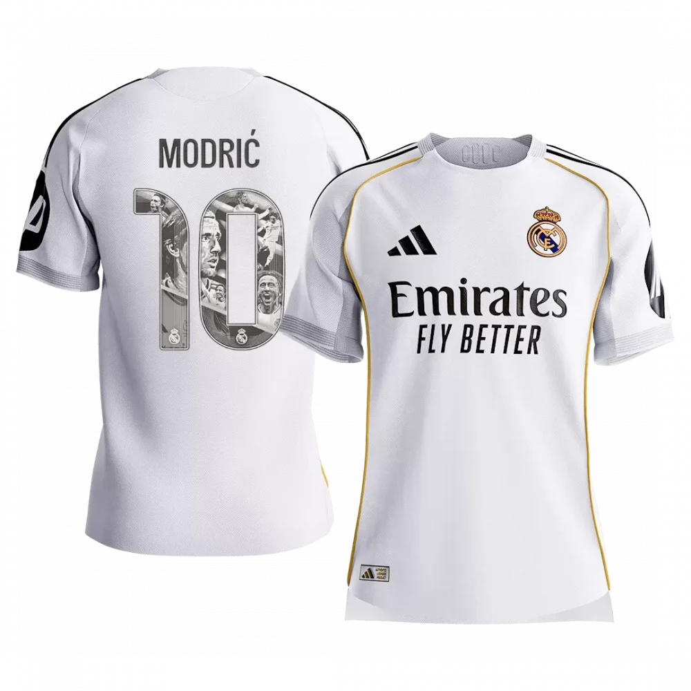 Step onto the pitch with the MODRIĆ Special #10 Real Madrid Home Authentic Soccer Jersey 2025/26, a tribute to one of football’s most brilliant midfield maestros. Featuring the timeless white base that symbolizes Real Madrid’s legacy of excellence, this jersey is accented with subtle gold piping reflecting the club’s royal heritage and a modern touch of sleek black detailing. The back number uniquely incorporates historic action shots, connecting past glory with present ambition.