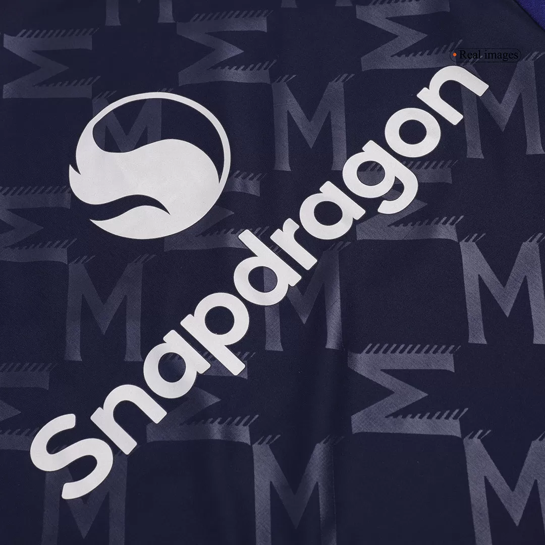 Step into the spotlight with the Manchester United Away Soccer Jersey, featuring a sleek navy-blue base adorned with subtle geometric patterns that add a modern edge while honoring the club’s rich legacy of resilience and unity. The classic collar and contrasting white accents on the shoulders and logos create a sharp, professional look that stands out both on and off the pitch.