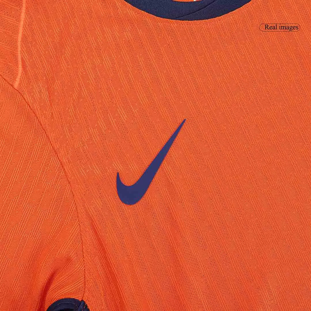 Embody the spirit of Dutch football in the Netherlands Home Authentic Soccer Jersey EURO. Featuring a vibrant orange base with subtle textured stripes and contrasting navy details on the collar and sleeves, this jersey honors the iconic “Oranje” legacy known worldwide for its bold, attacking style and rich football heritage. Built for the passionate fan and fierce competitor alike, it blends timeless design with modern performance.