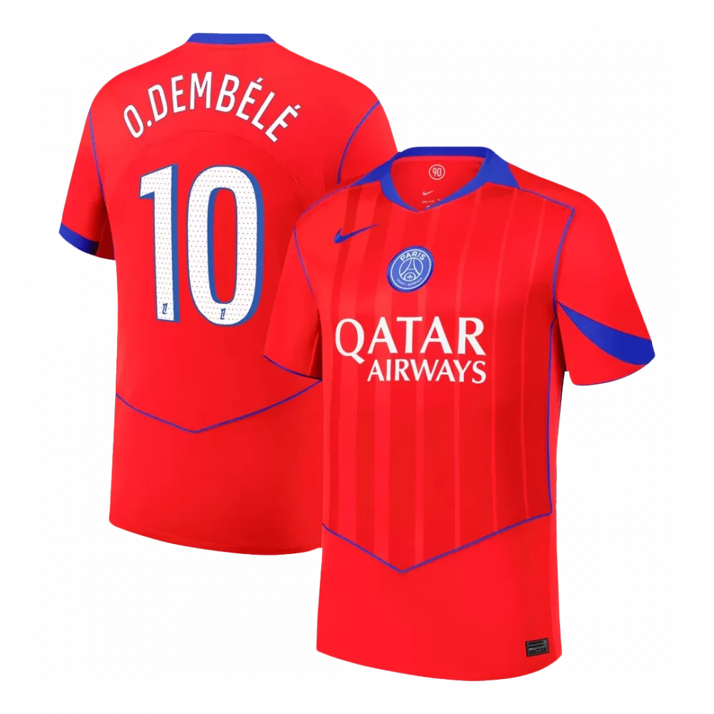 Step into the dynamic spirit of Paris with the O.Dembélé #10 PSG Third Away Soccer Jersey 2025/26. Featuring a bold red base complemented by striking blue accents and subtle vertical stripes, this jersey captures the passion and flair synonymous with PSG’s relentless pursuit of greatness. The design pays homage to the club’s vibrant identity while pushing a fresh, modern look for away fans and players alike.