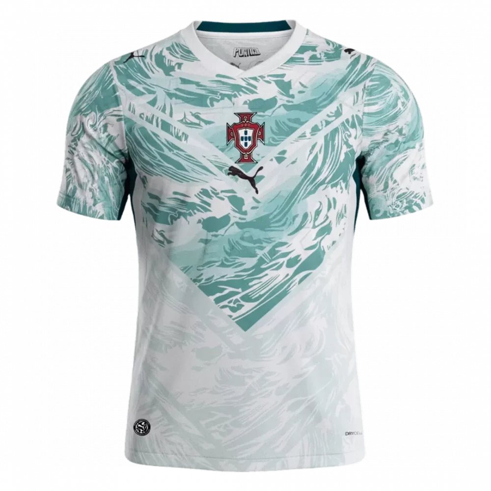 Dive into the spirit of Portugal with the Away Soccer Jersey for the 2026 World Cup. Featuring a dynamic sea-inspired pattern in soft teal and white hues, this jersey reflects the nation’s deep connection to the ocean and its historic maritime legacy. Lightweight and breathable, it’s designed to keep you cool and comfortable whether on the pitch or in the stands.