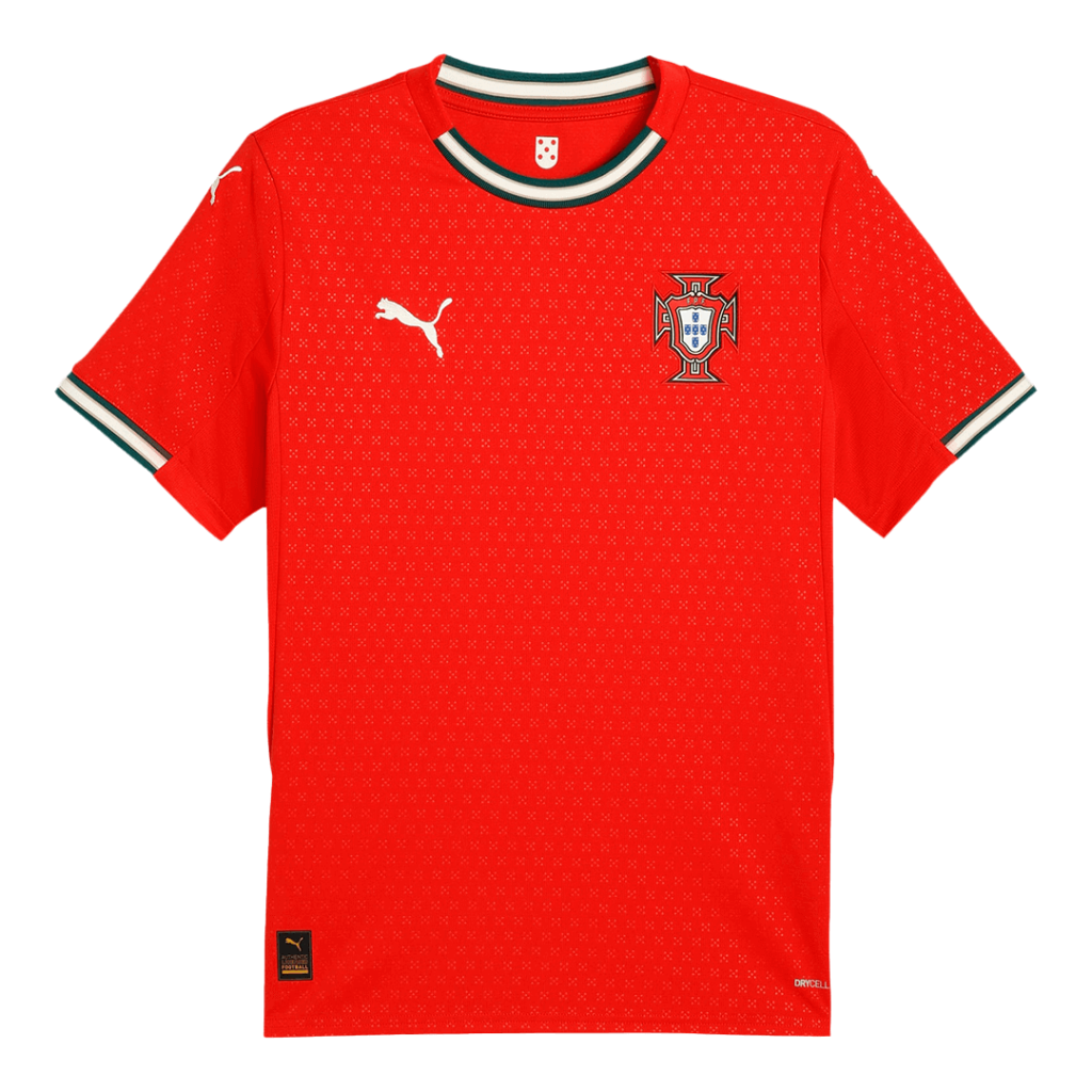 Step onto the pitch with the Portugal Home Jerseys Kit 2025, a vibrant tribute to the nation’s rich football heritage. Featuring a striking red jersey adorned with subtle geometric patterns and green-and-white trim on the collar and cuffs, this kit reflects the iconic colors of the Portuguese flag and the passion of its people. Paired with deep green shorts, it embodies tradition and pride while pushing performance to the next level.