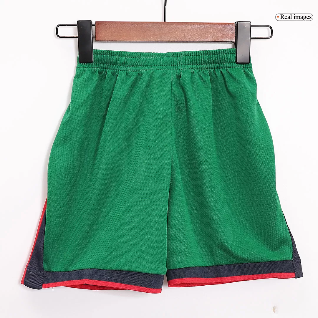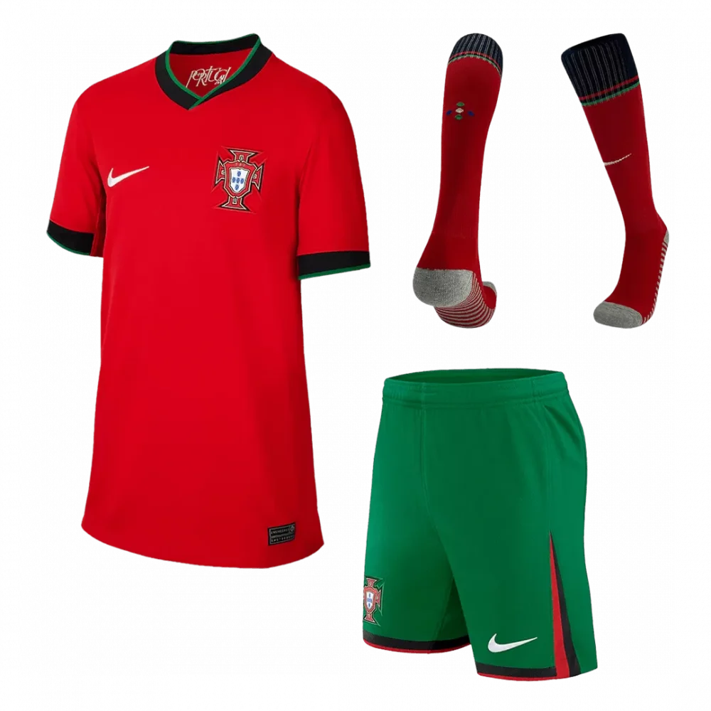 Step onto the pitch with pride in the Portugal Home Kids Soccer Jerseys Full Kit EURO, a vibrant tribute to the nation’s storied football heritage. Featuring the classic bold red jersey with contrasting black and green trim, the kit echoes Portugal’s passion and relentless spirit. Paired with striking green shorts and matching red socks, this full ensemble captures the heart of the Portuguese squad with a modern, dynamic flair.