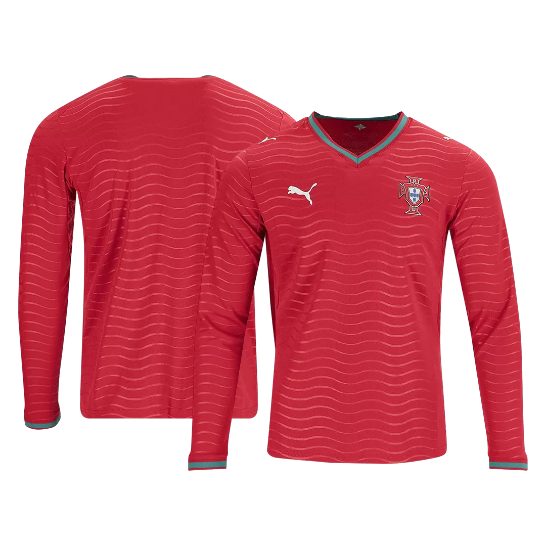 Step into the heart of Portuguese pride with the Portugal Home Long Sleeve Player Version Jersey for World Cup 2026. Featuring a vibrant red base adorned with subtle wave patterns symbolizing the nation’s deep connection to the sea, this jersey blends tradition and modernity. The classic green and red trims nod to Portugal’s rich history, empowering players to take on the world with passion and strength.