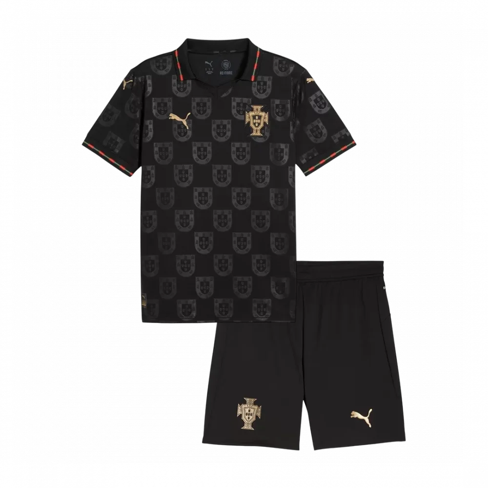 Step onto the pitch with the Portugal World Cup Special Kids Soccer Jerseys Kit 2026, featuring a sleek black design adorned with a subtle repeating crest pattern that honors Portugal’s rich football heritage. Gold accents on the crest and logos bring a touch of elegance, while the collar and sleeve trim showcase the national colors with striking red and green details. Perfect for young fans ready to celebrate Portugal’s spirit and passion.