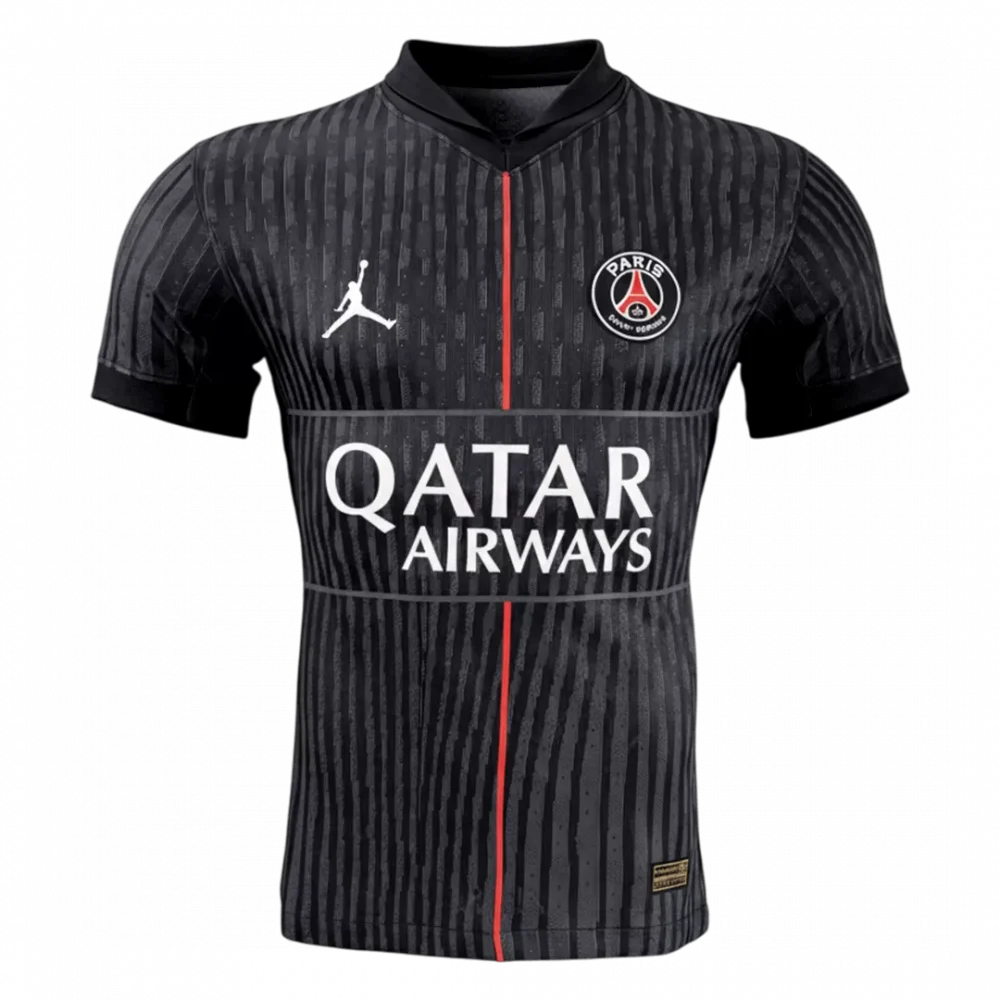 Step into the future of football style with the PSG Fourth Away Player Version Jersey 2025/26. Featuring a sleek black base adorned with dynamic vertical stripes and a bold red central stripe, this jersey echoes Paris Saint-Germain’s modern edge and ambition. The subtle pattern pays homage to the city’s vibrant energy, while the classic crest celebrates the club’s rich heritage.