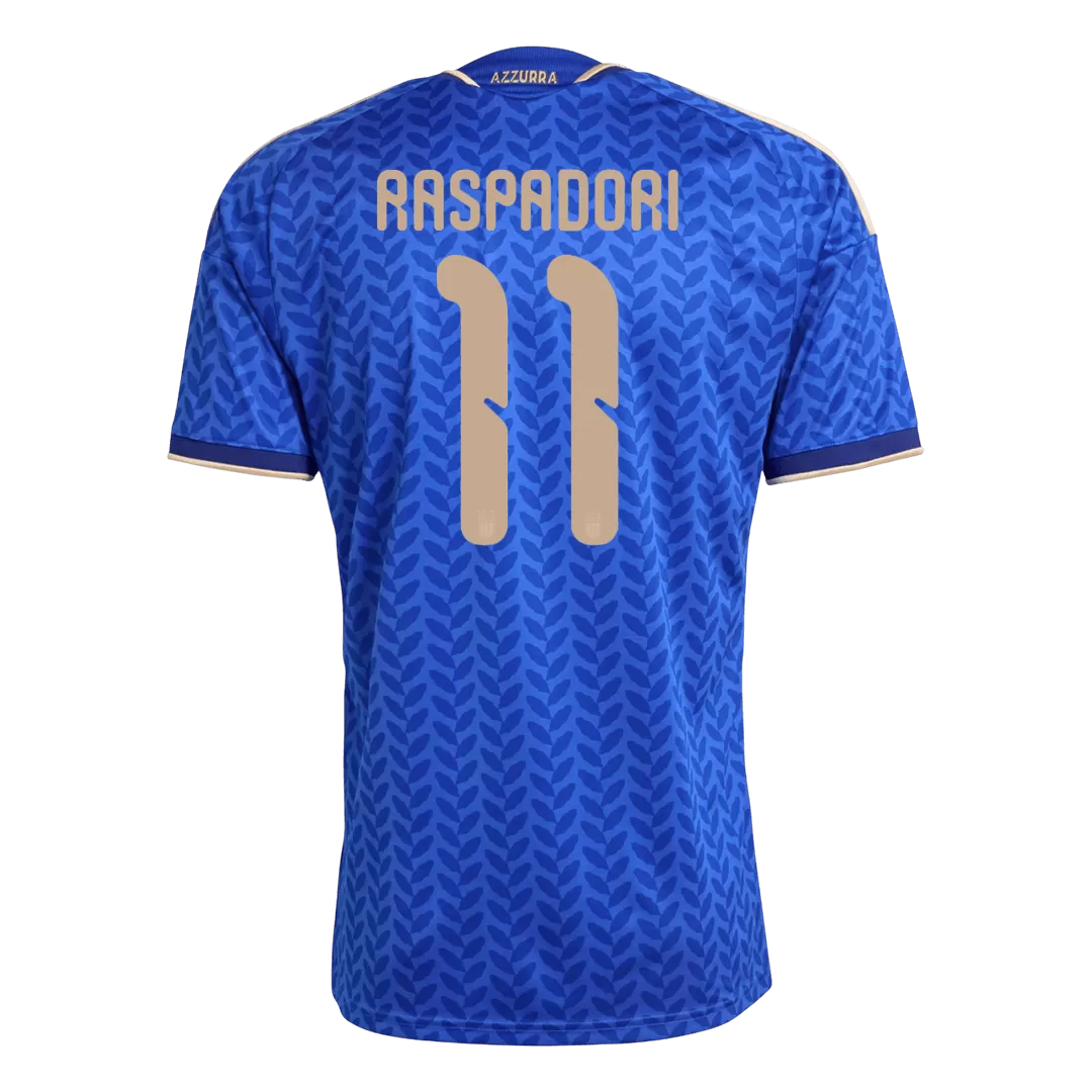 Step into the legacy of Italian football with the RASPADORI #11 Italy Home Soccer Jersey for the 2026 World Cup. This striking blue jersey is adorned with a subtle yet dynamic pattern inspired by Italy’s rich cultural heritage, enhanced with elegant gold accents on the shoulders and trims that symbolize the Azzurri’s prestige and four-star World Cup triumphs. Represent the spirit of one of football’s most storied nations with unmatched style and comfort.